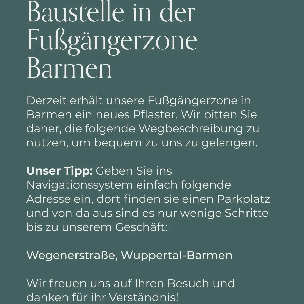 Derzeit erhält unsere Fußgängerzone in Barmen ein neues Pflaster. Wir bitten Sie daher, die folgende Wegbeschreibung zu nutzen, um bequem zu uns zu gelangen.