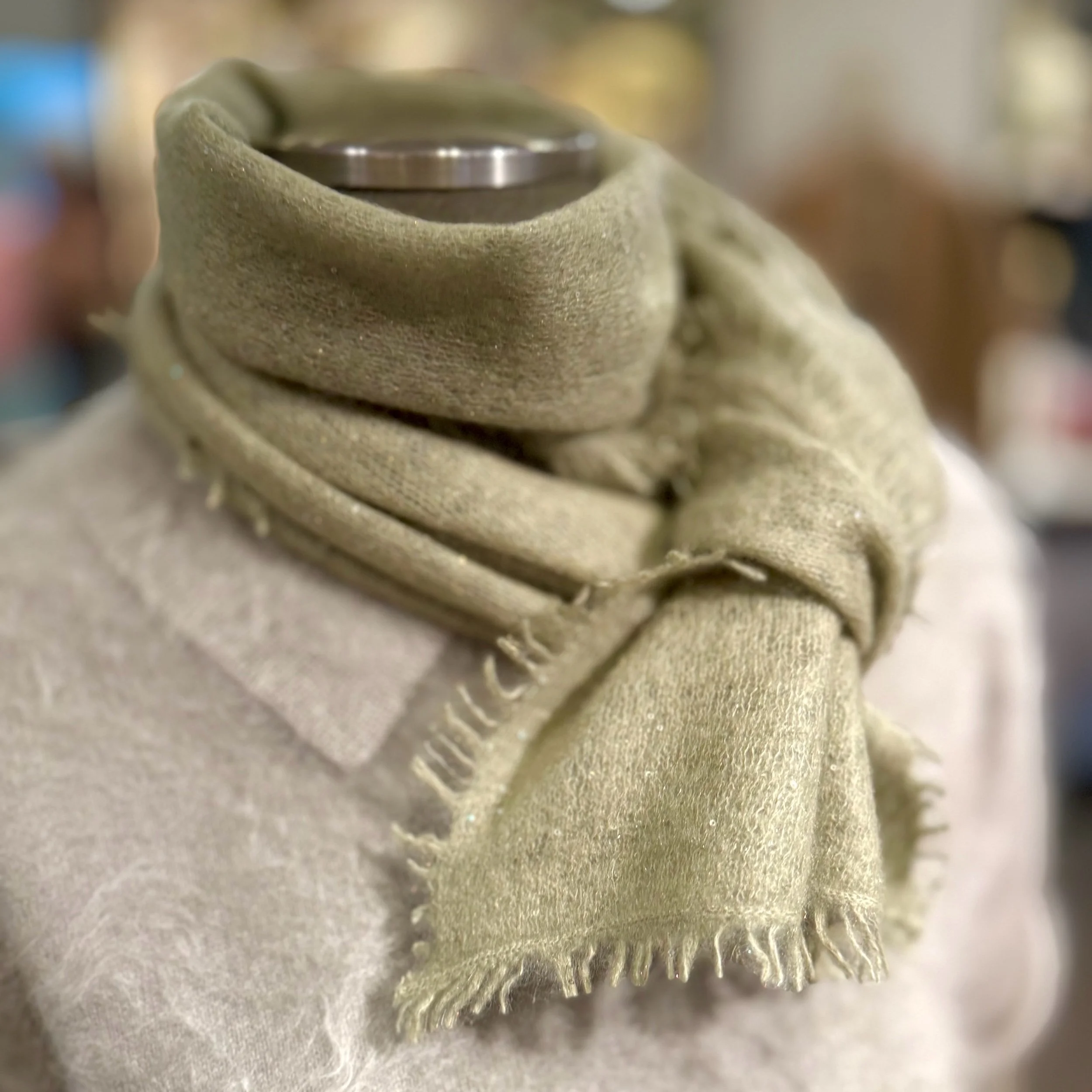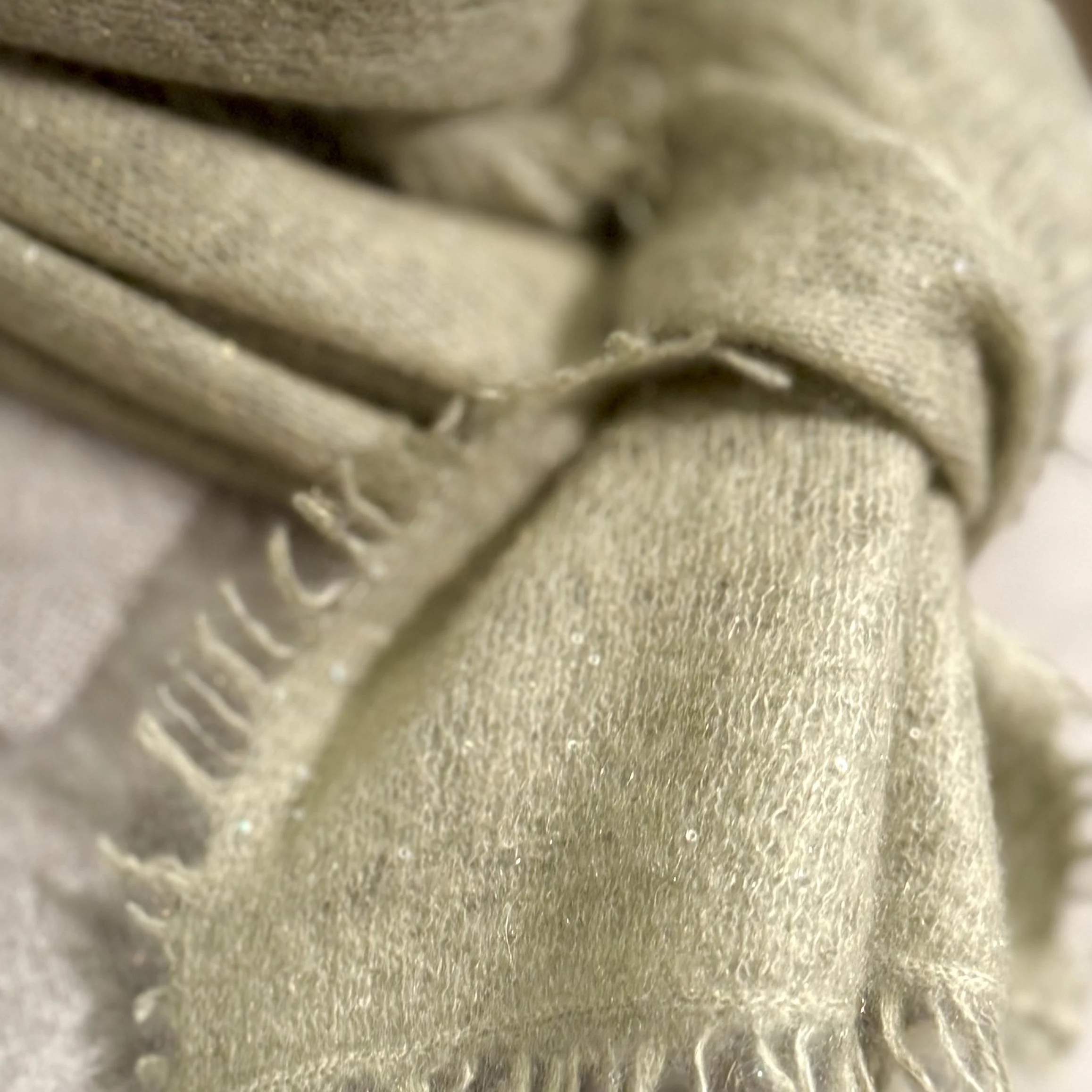 Ein feiner, kleiner Schal mit Fransen und glitzernden Pailletten.