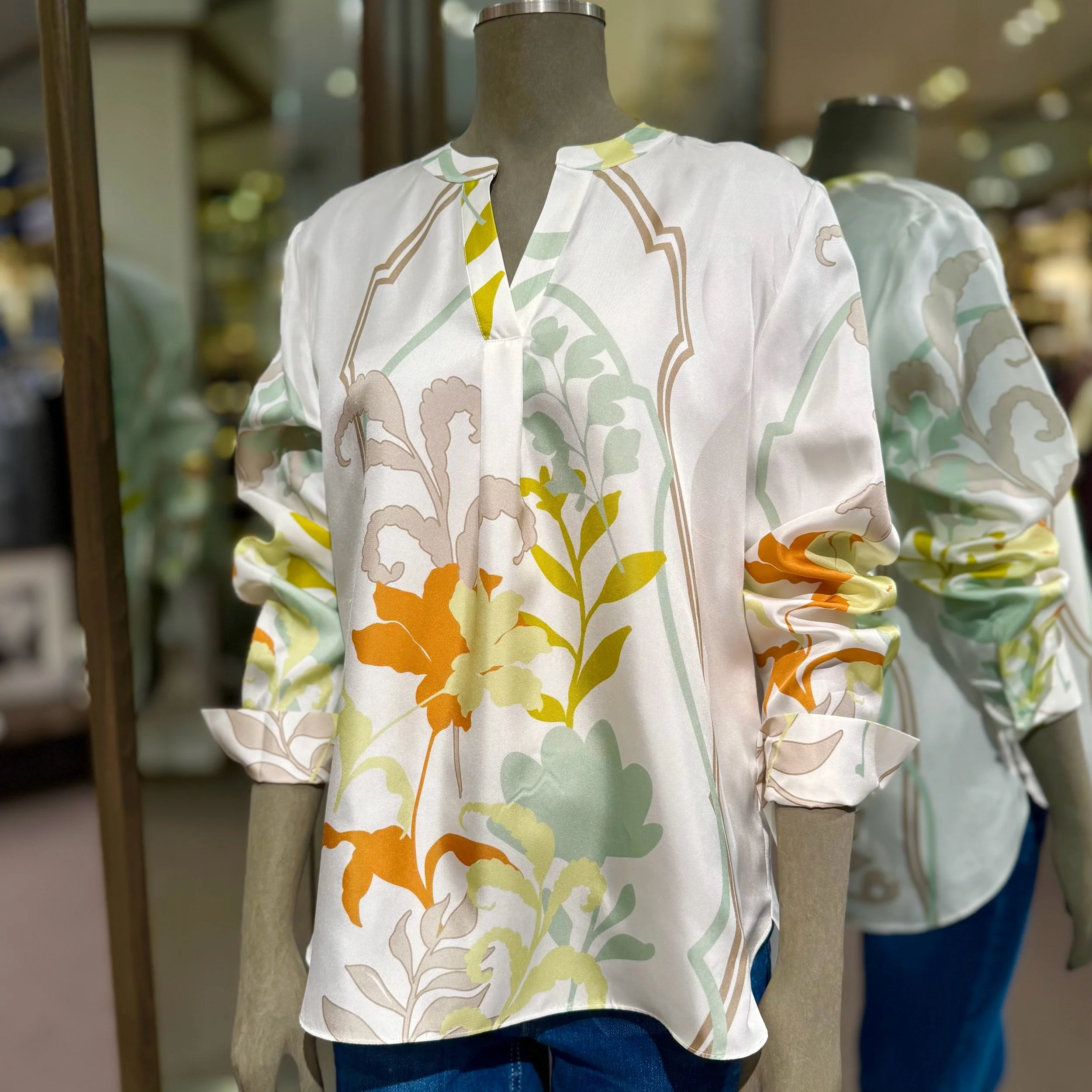 Diese Kurzarmbluse des Schweizer Luxus Labels Lis Lareida hat Flügelärmel, die mit einem femininen Volantsaum versehen sind.