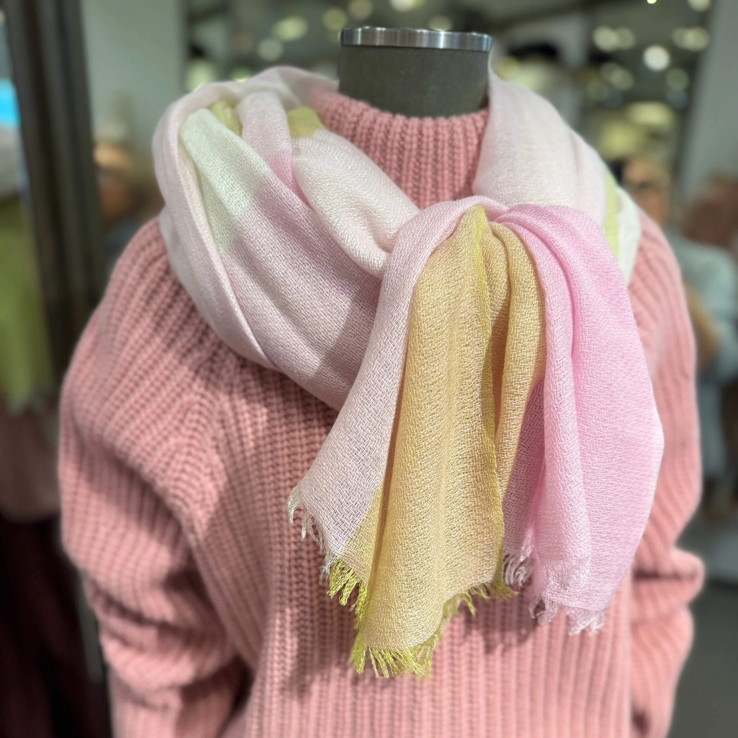 Dieser hochwertige, weich fallende Schal besticht durch seine zarte Pastell-Farbgebung und seinen eleganten, leicht schimmernden Stoffcharakter. Die fließenden Farbübergänge in Rosé, Creme, Zitronengelb und Hellpink verleihen ihm eine feminine, moderne und frühlingshafte Optik. Dank der feinen, glatten Webstruktur schmiegt sich der Schal angenehm an die Haut und sorgt für ein luxuriöses Tragegefühl.