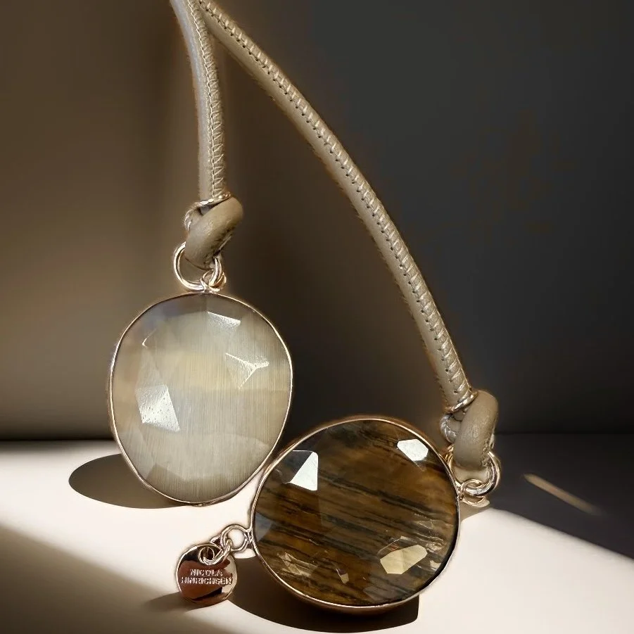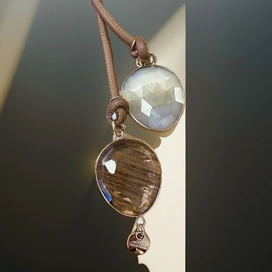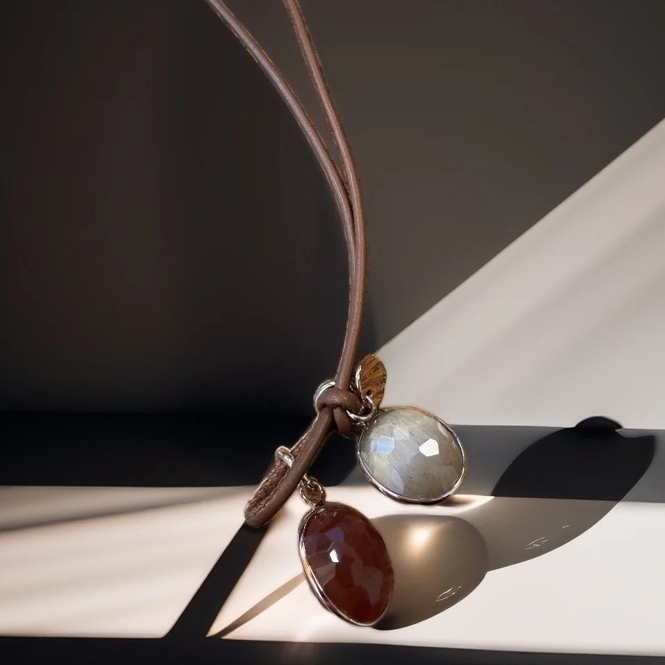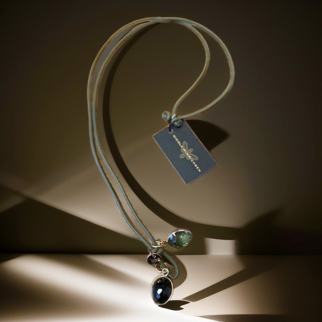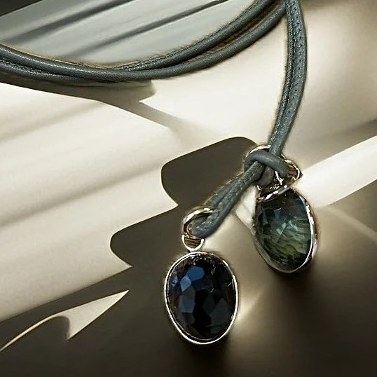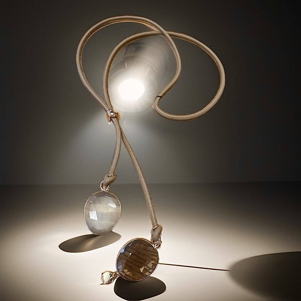 Lange Lederkette mit zwei großen, facettierten Edelsteinen.