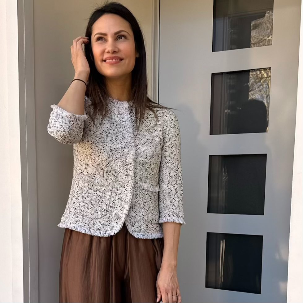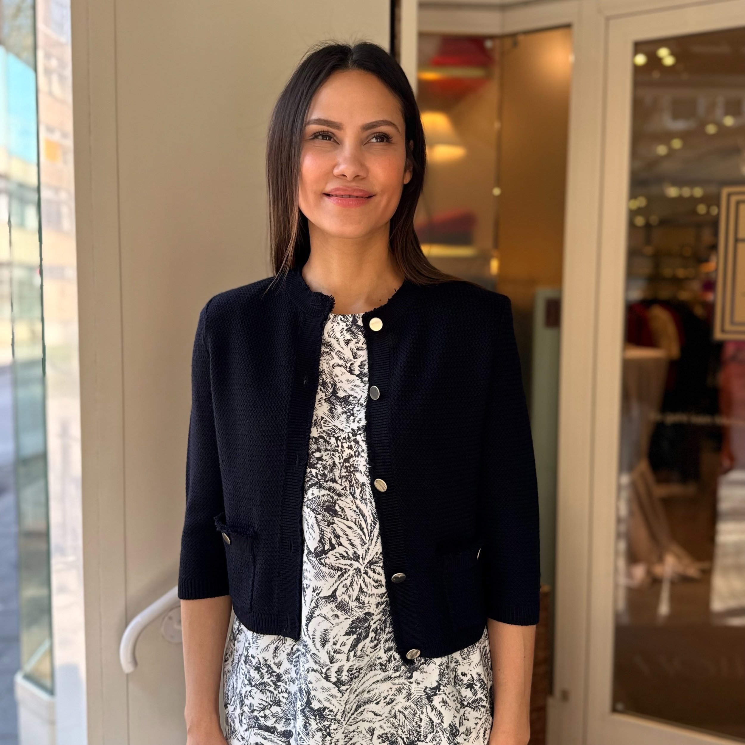Diese elegante, kragenlose Jacke aus konfektioniertem Strick hat einen verkürzten Arm und ist vielseitig tragbar.