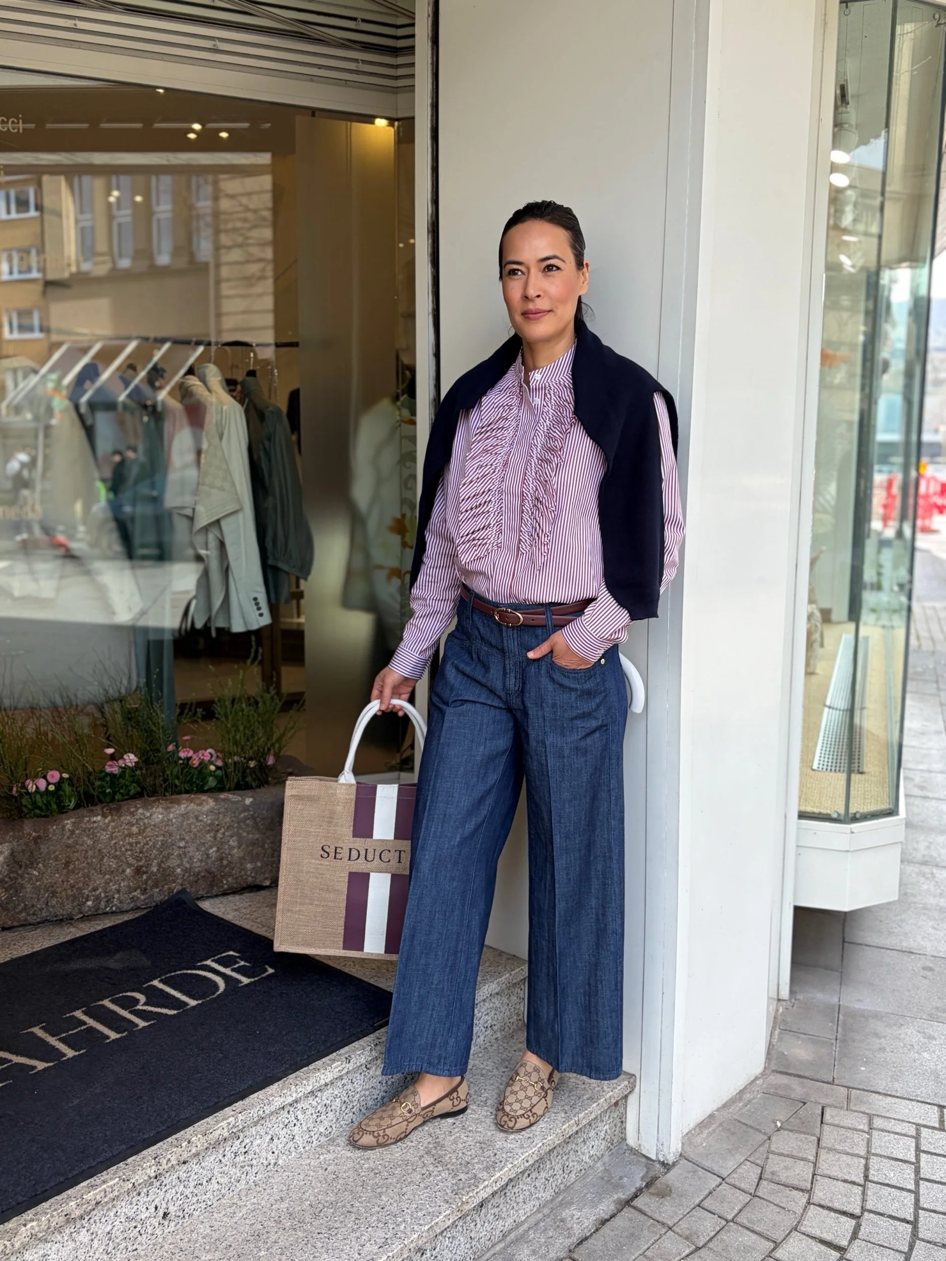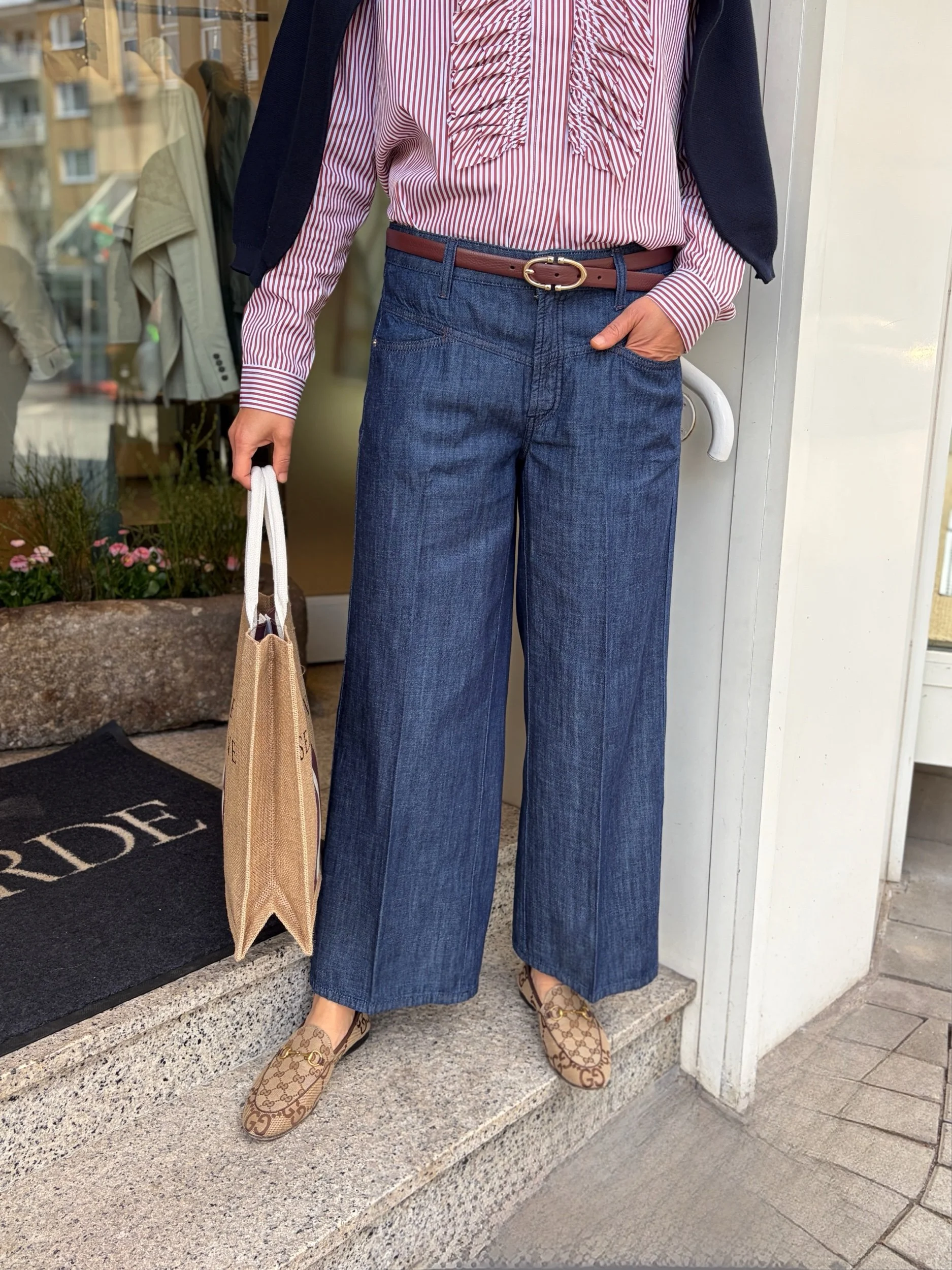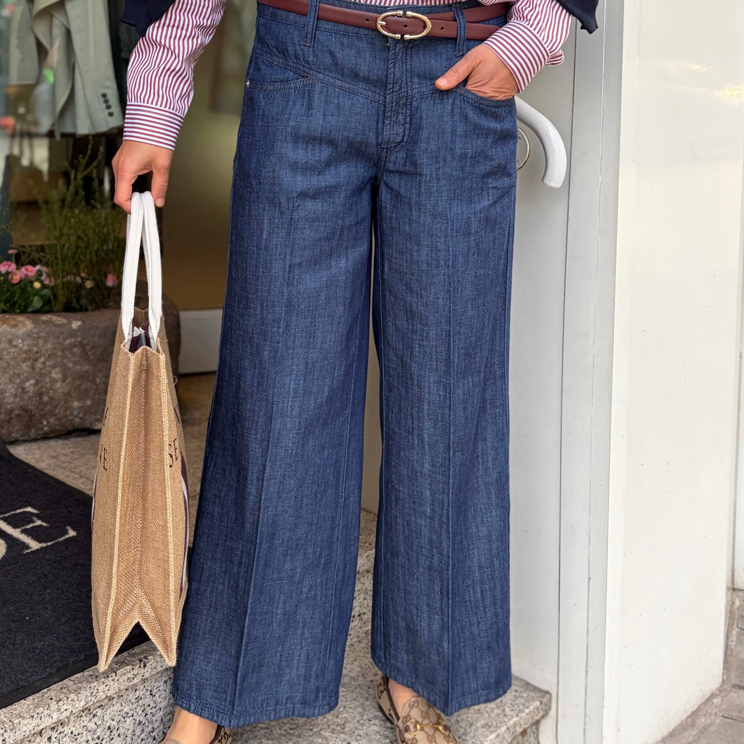 Die Jeans Aimee hat eine hohe Leibhöhe, ein weites Bein, Bügelfalten und ist aus einer festen Denim Qualität.