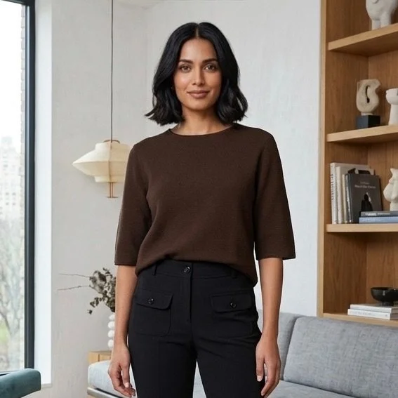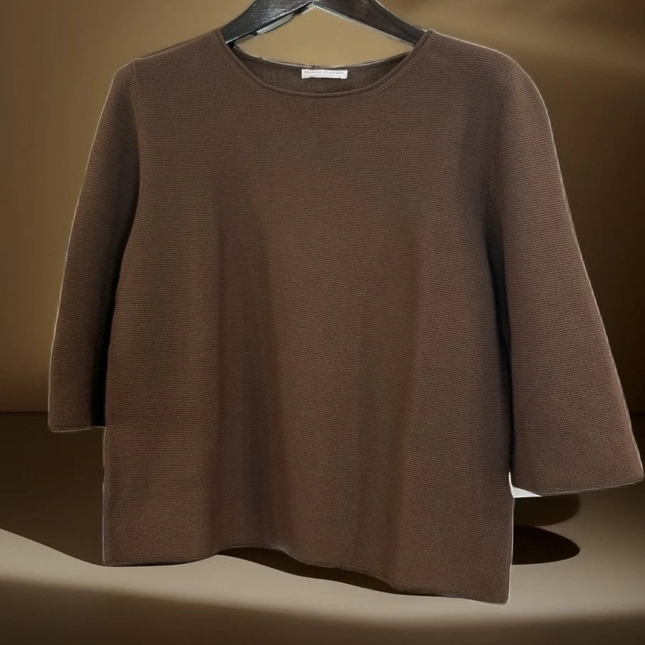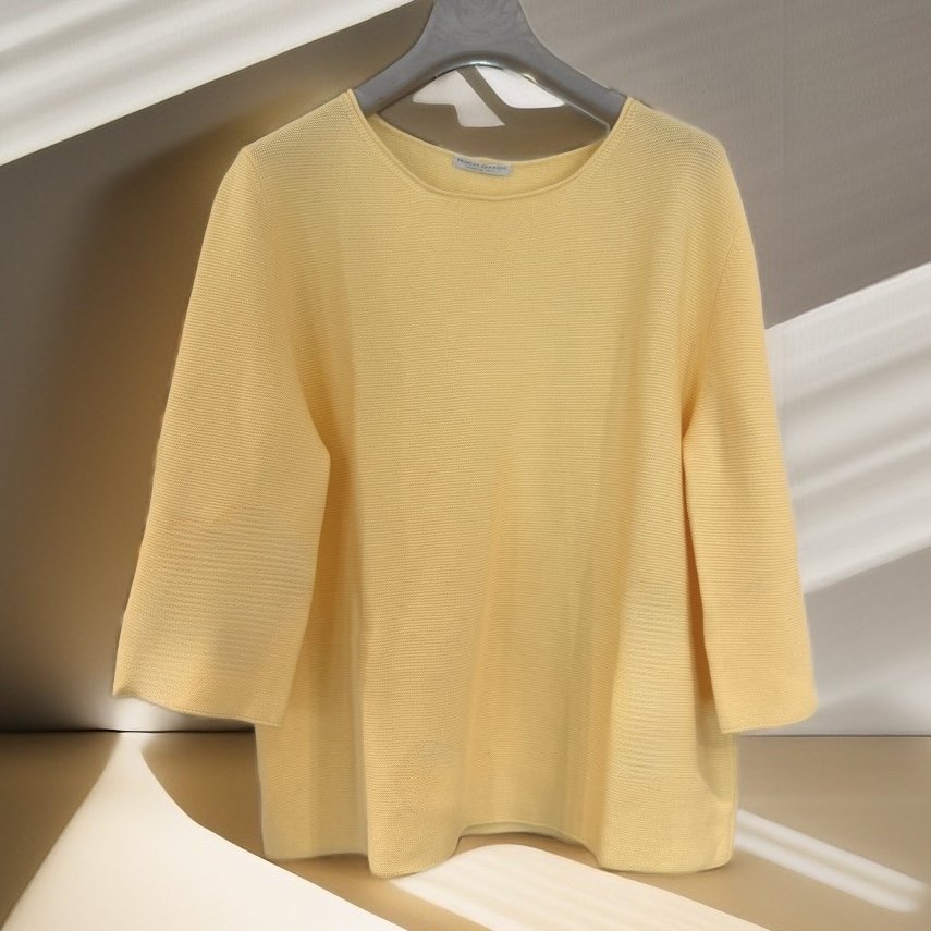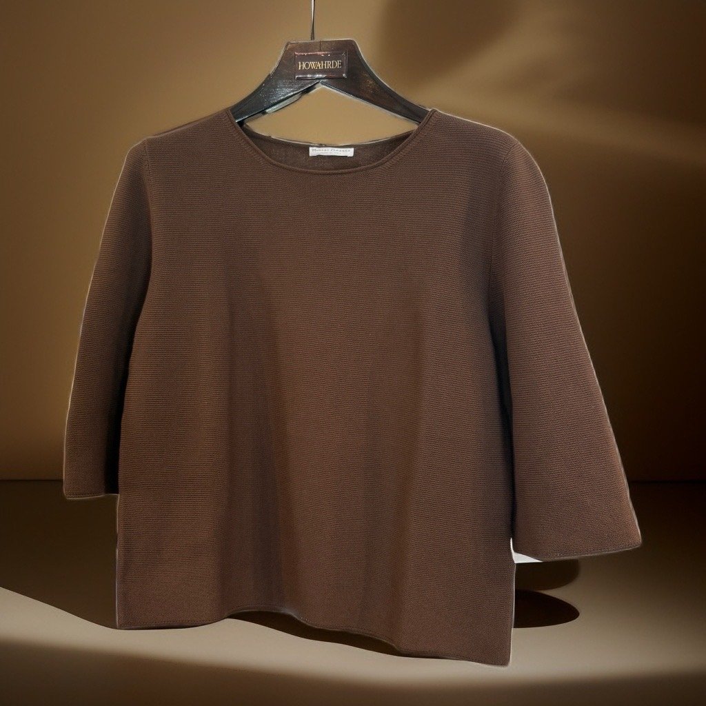 Dieser linksgestrickte Pullover hat einen 3/4 Arm und ist sehr pflegeleicht. Er peelt nicht, ist angenehm zu tragen und sieht immer gepflegt aus.