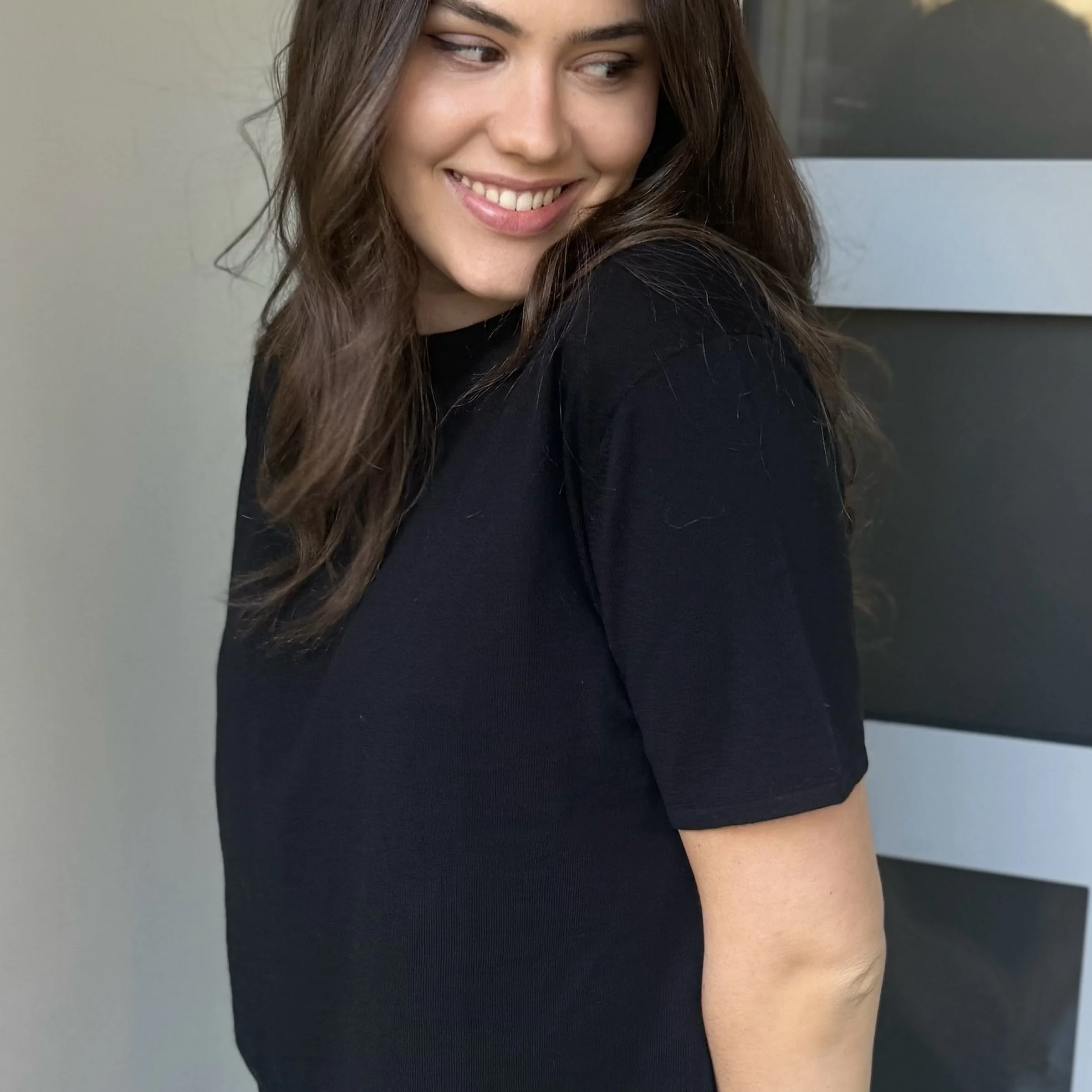 Außer zu jeder Art von Hose passt das Shirt auch wunderbar zu fließenden Röcken.