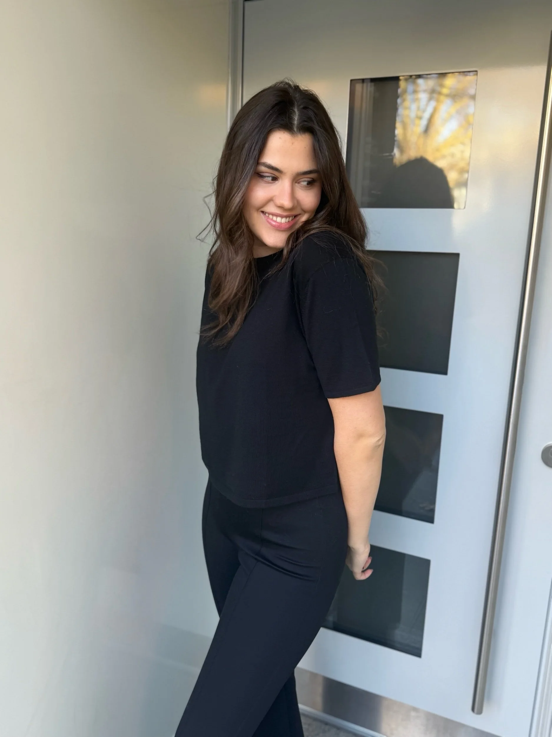 Es zeichnet sich durch gerippte Abschlüsse, eine lockere Passform und einen Rundhalsausschnitt aus.