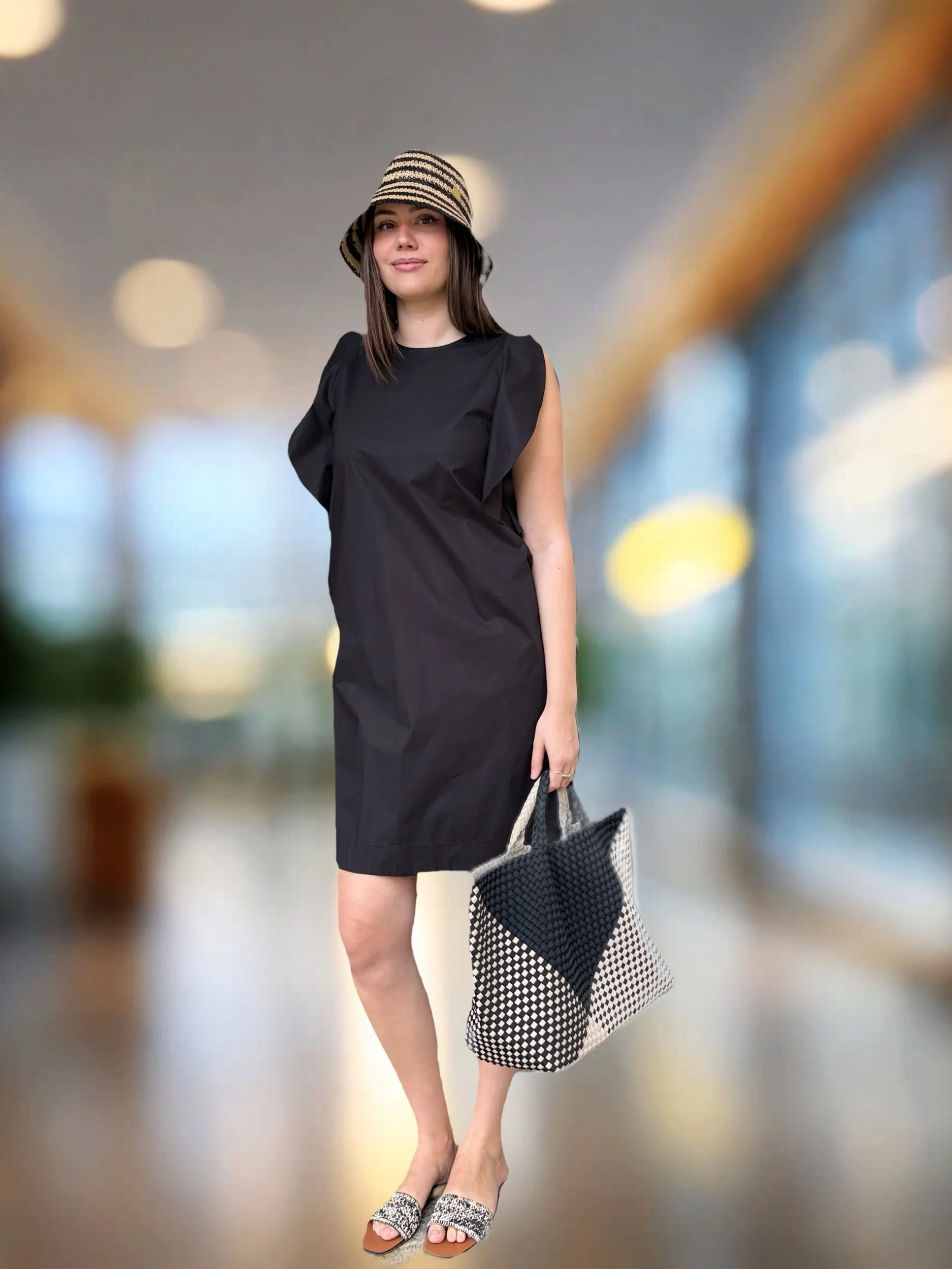 Flecht-Shopper aus handgewebtem Neopren und separater kleiner Tasche mit Reißverschluss. Sie ist sehr hochwertig verarbeitet.