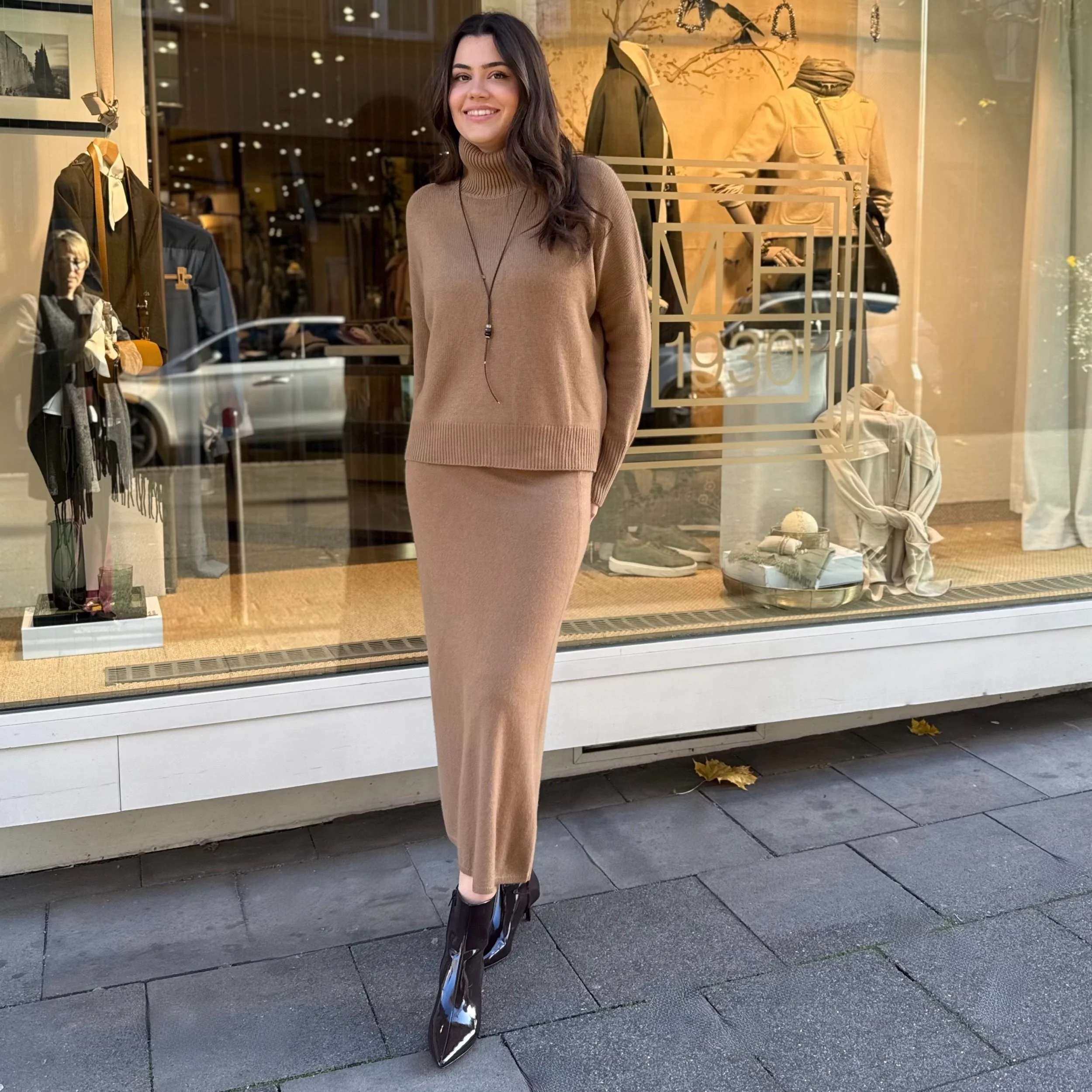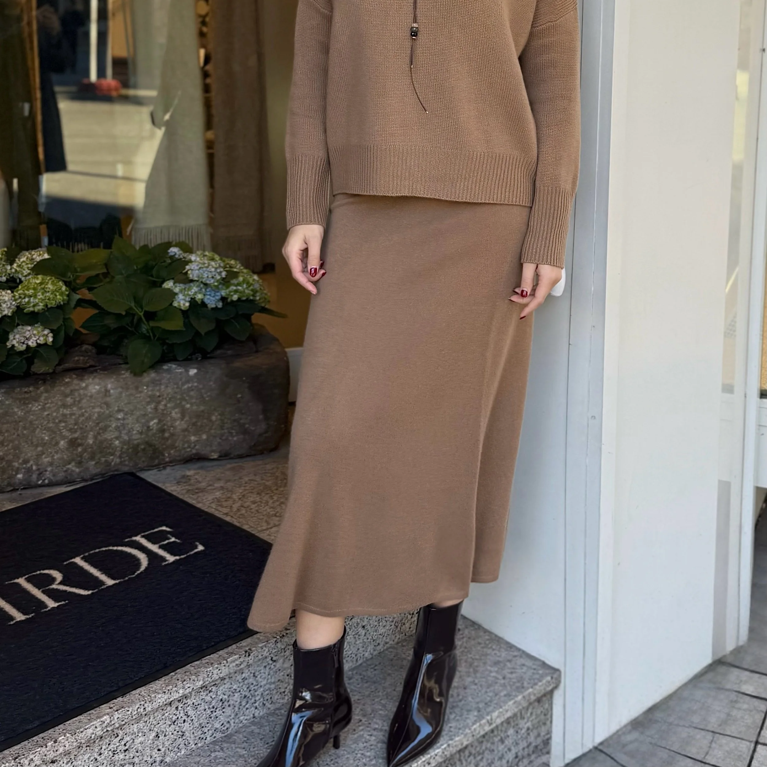 Der lange Strickrock ‚Dolly’ ist aus reinem Cashmere, er hat ein elastisches Taillenband und fällt in einer grazilen A-Line Silhouette.