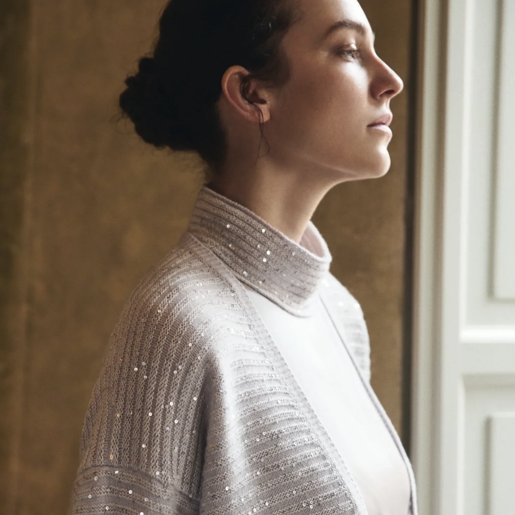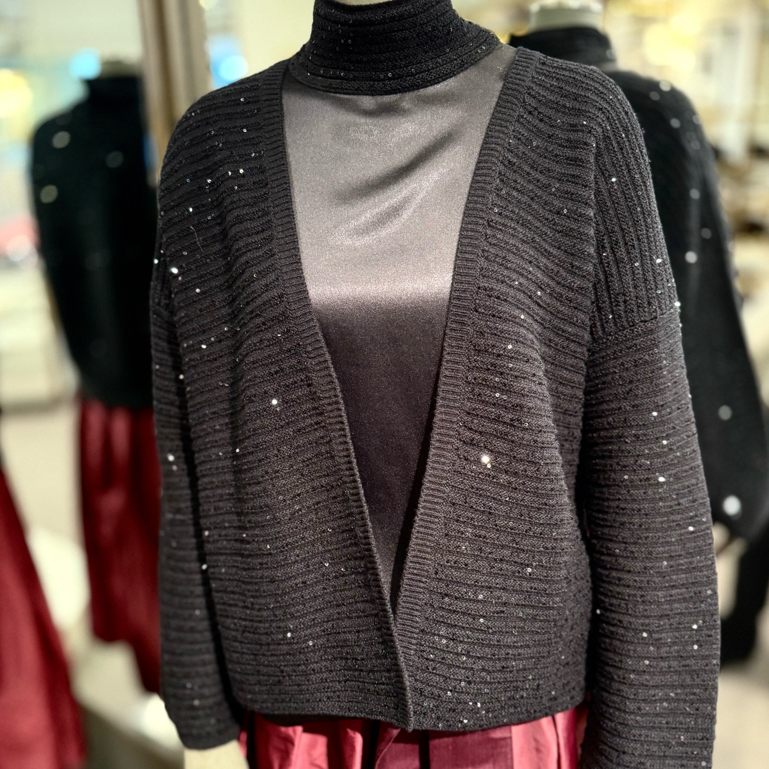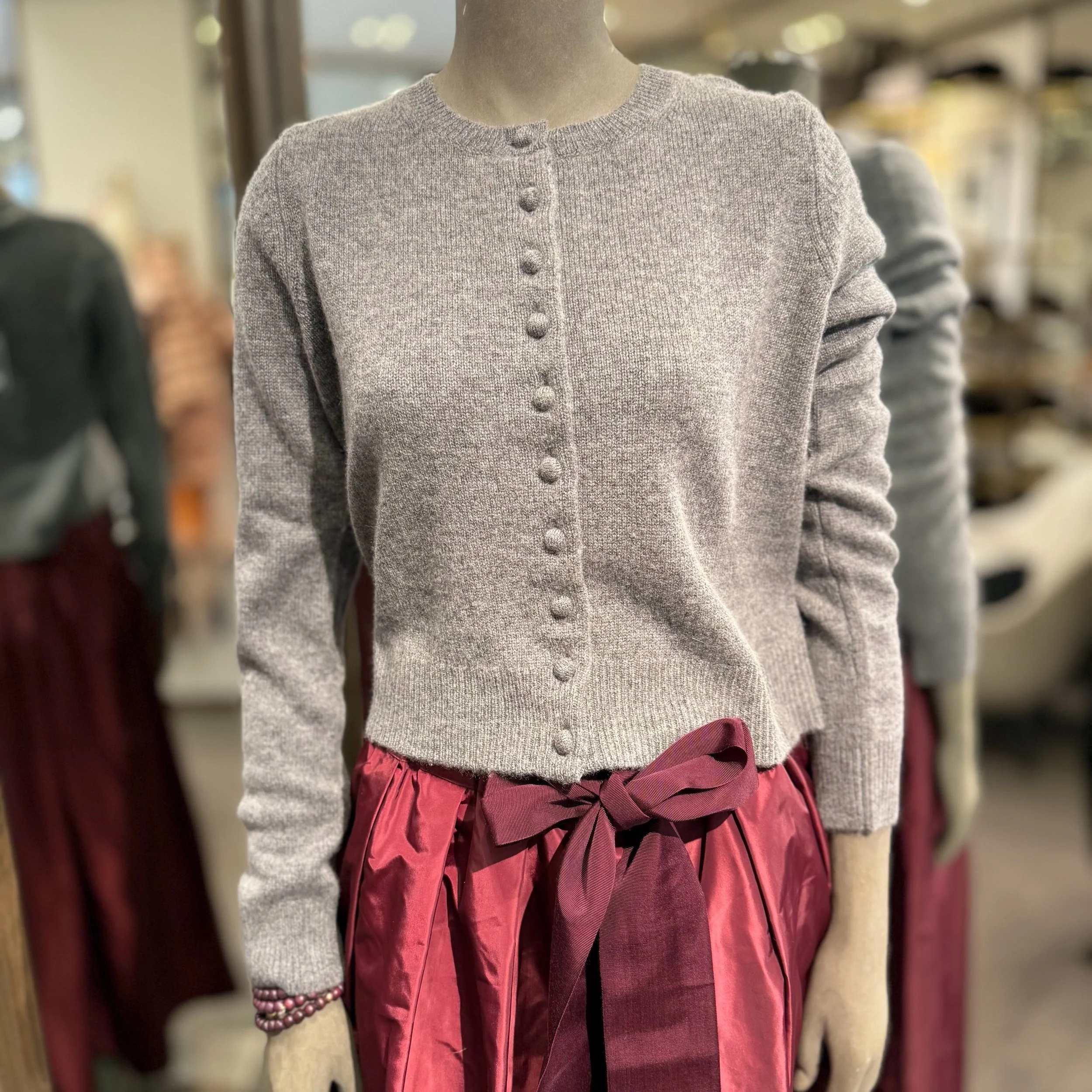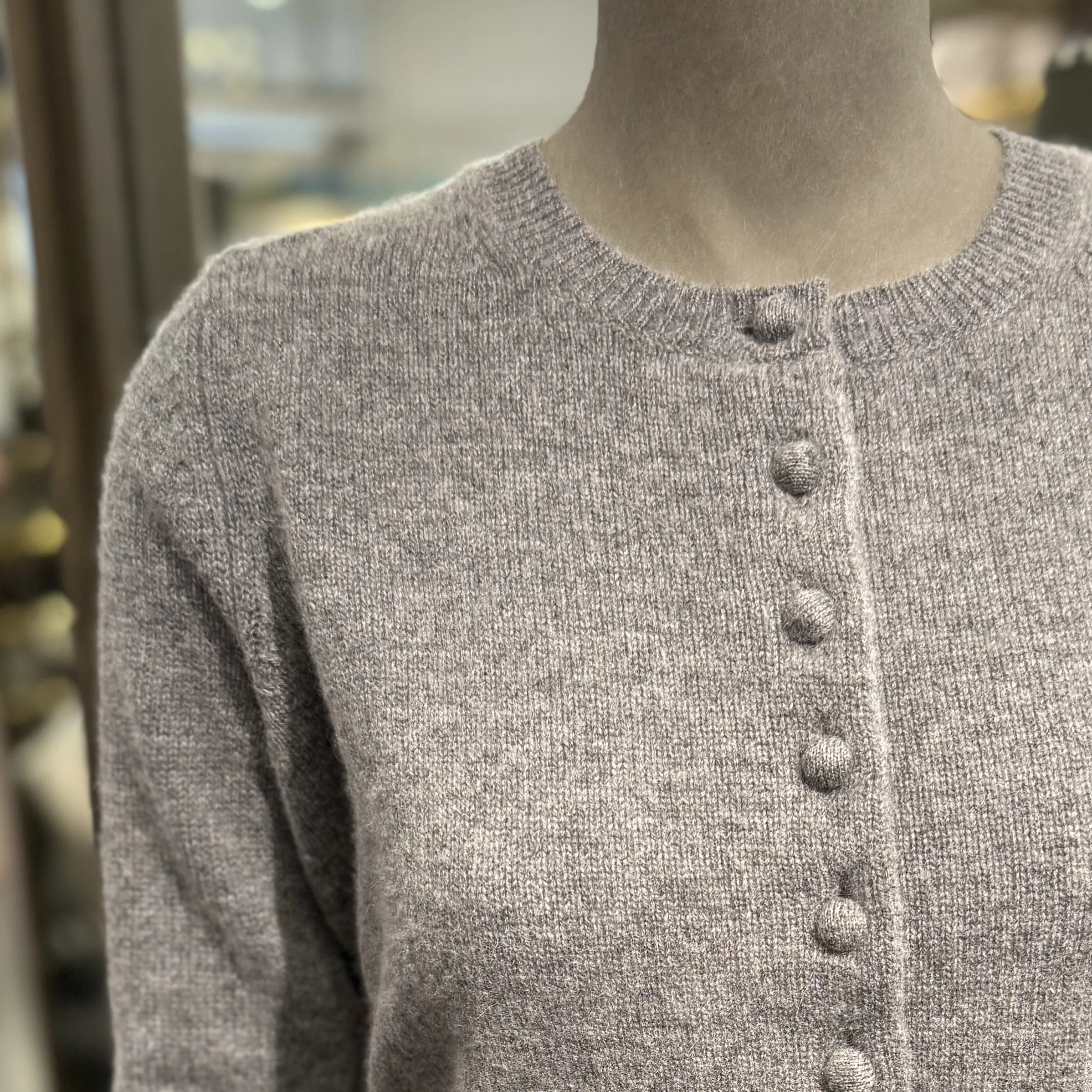 Kurze Strickjacke mit Rundhals, die runden Knöpfe sind bezogen und die Jacke passt toll zu Röcken.