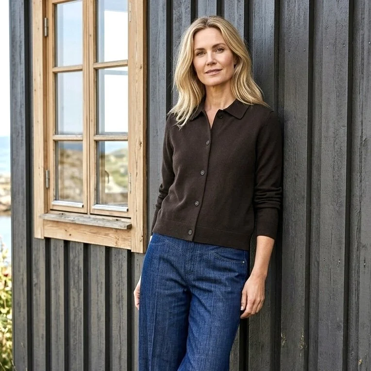 Diese wunderschöne Strickjacke mit Kragen strahlt Schlichtheit und Raffinesse aus – perfekt für einen stilvollen Auftritt im Alltag oder zu besonderen Anlässen.