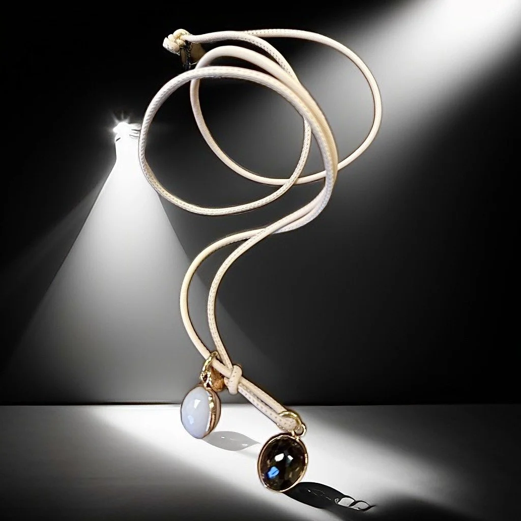 Lange Lederkette mit zwei großen, facettierten Edelsteinen.