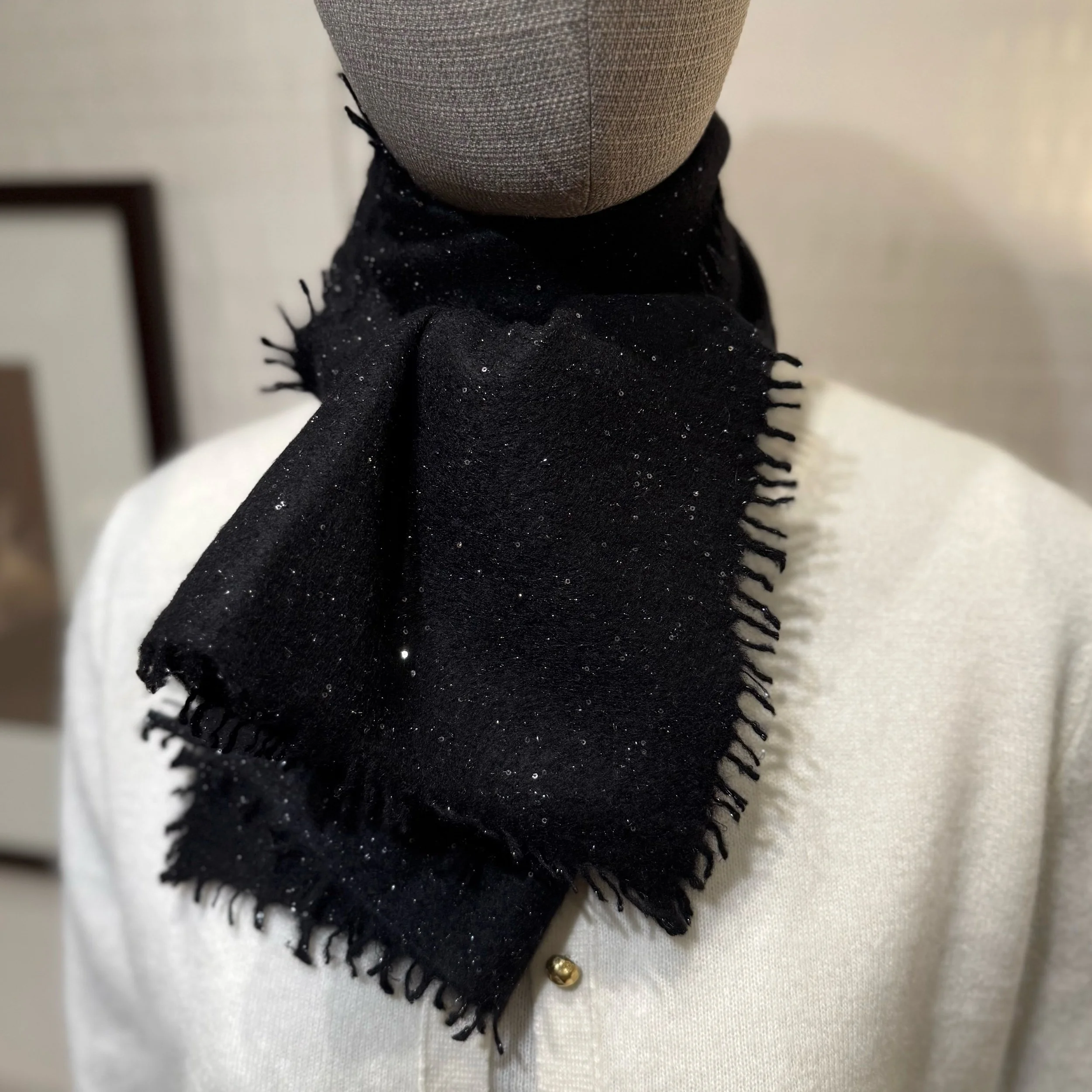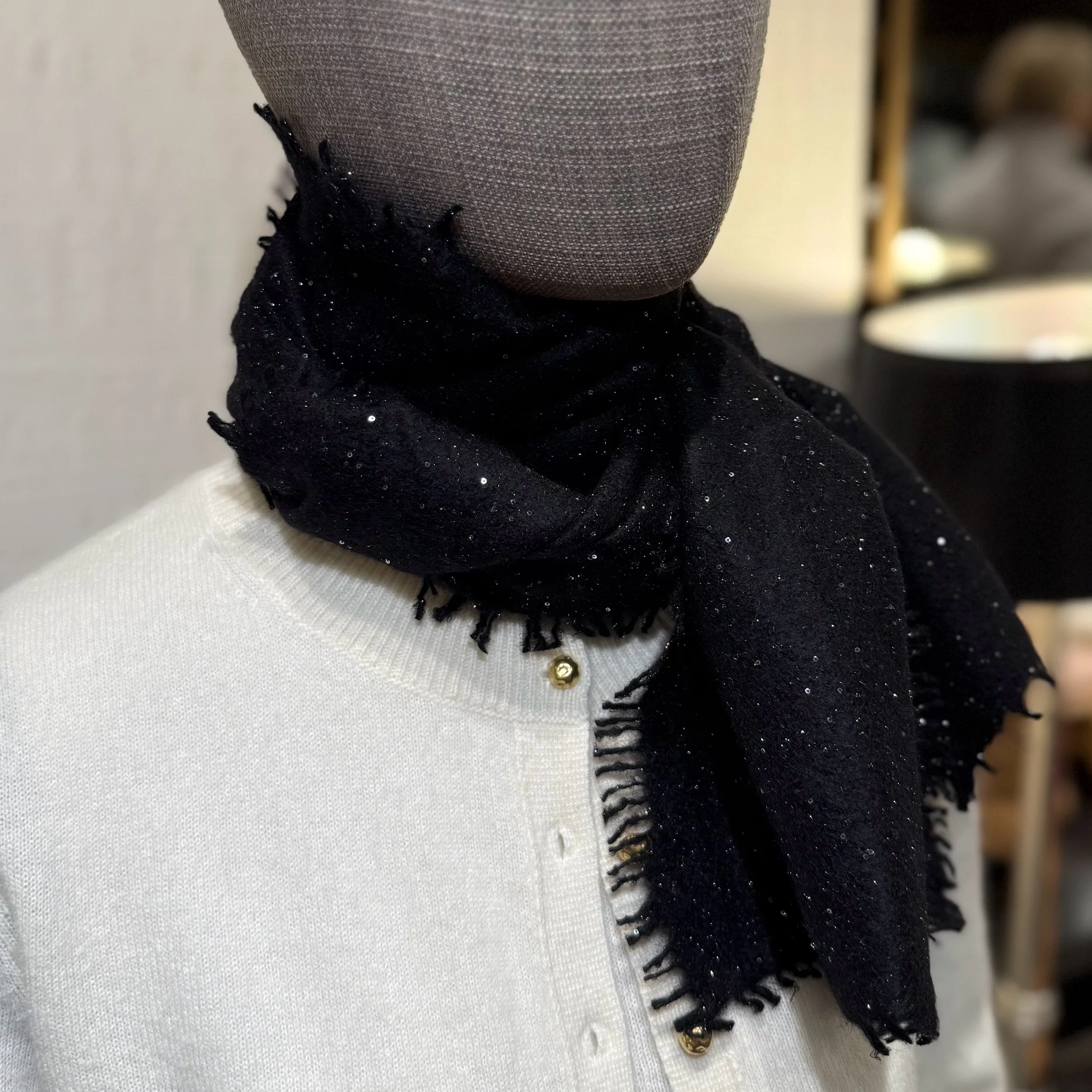 Ein wunderschöner schmaler Schal mit Pailletten und Fransen, den man auf verschiedene Art und Weise binden kann. Er fühlt sich fantastisch an.