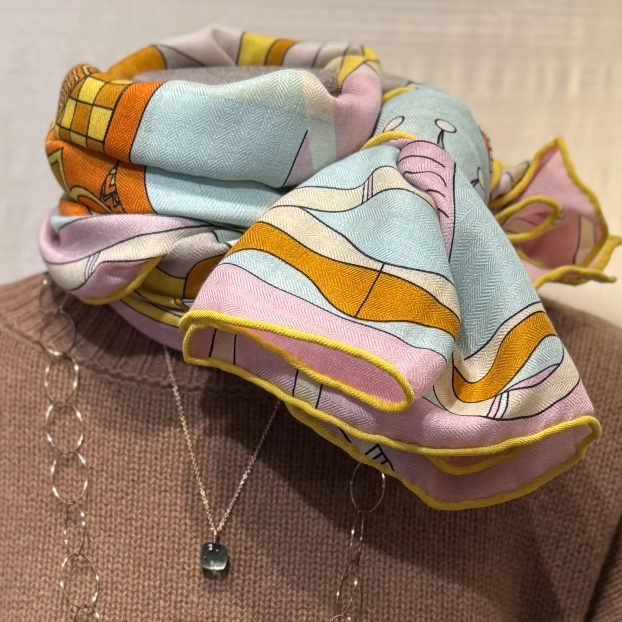 Dieser großzügige Schal ist ein echtes Statement-Piece! Das fließend weiche Material sorgt für angenehme Wärme, während das farbenfrohe, geschwungene Muster in Pink, Grün, Orange und Blau jedem Outfit einen frischen, lebendigen Akzent verleiht.