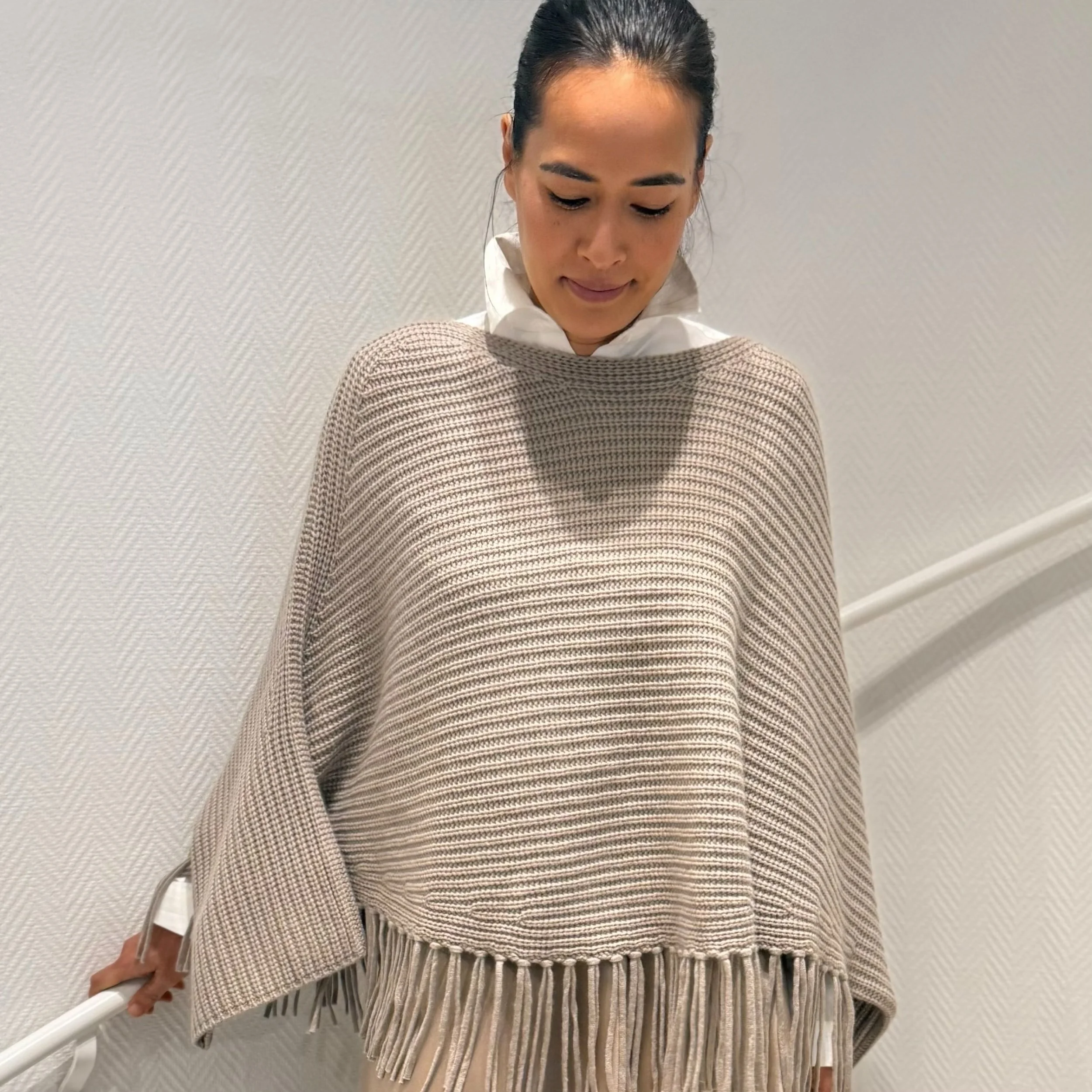 Dieses wunderschöne Strickcape im Halbpatent-Strick hat lange Fransen und ist vielseitig einsetzbar.