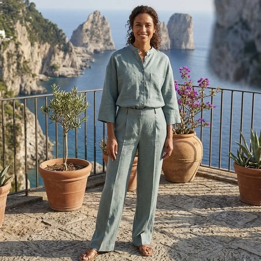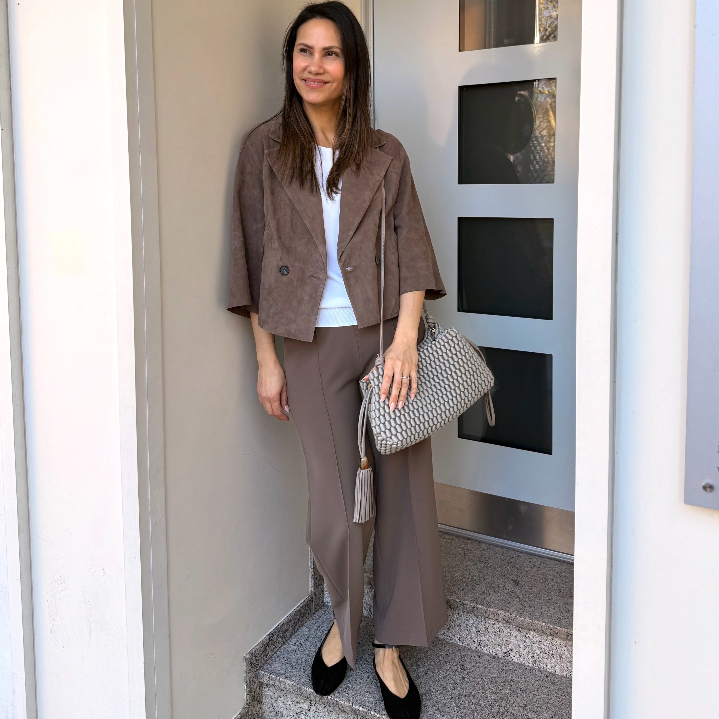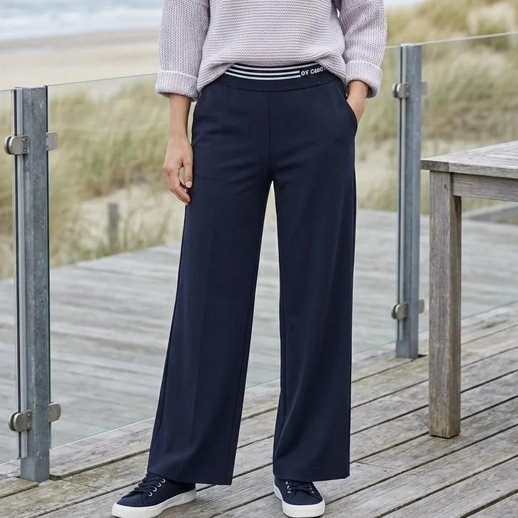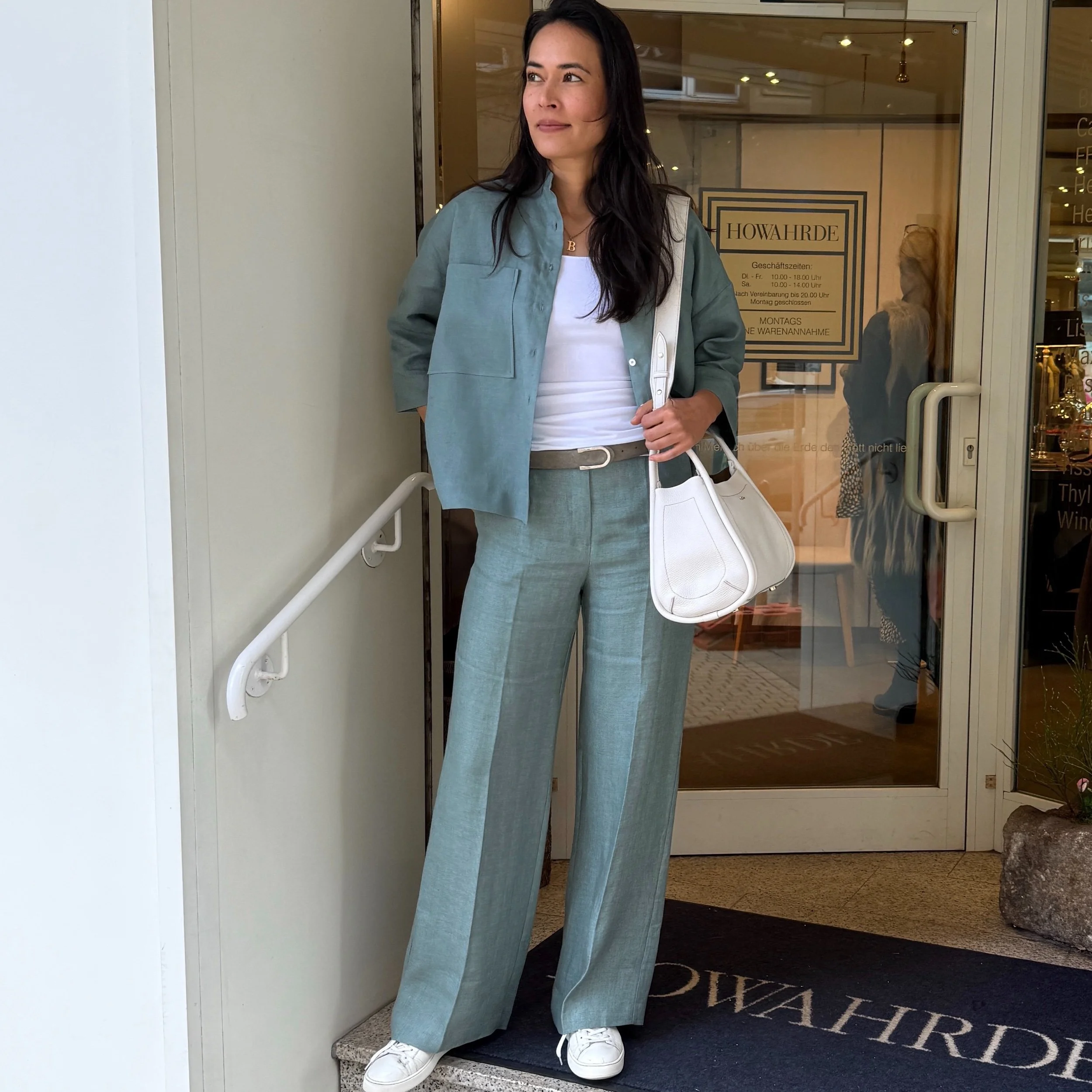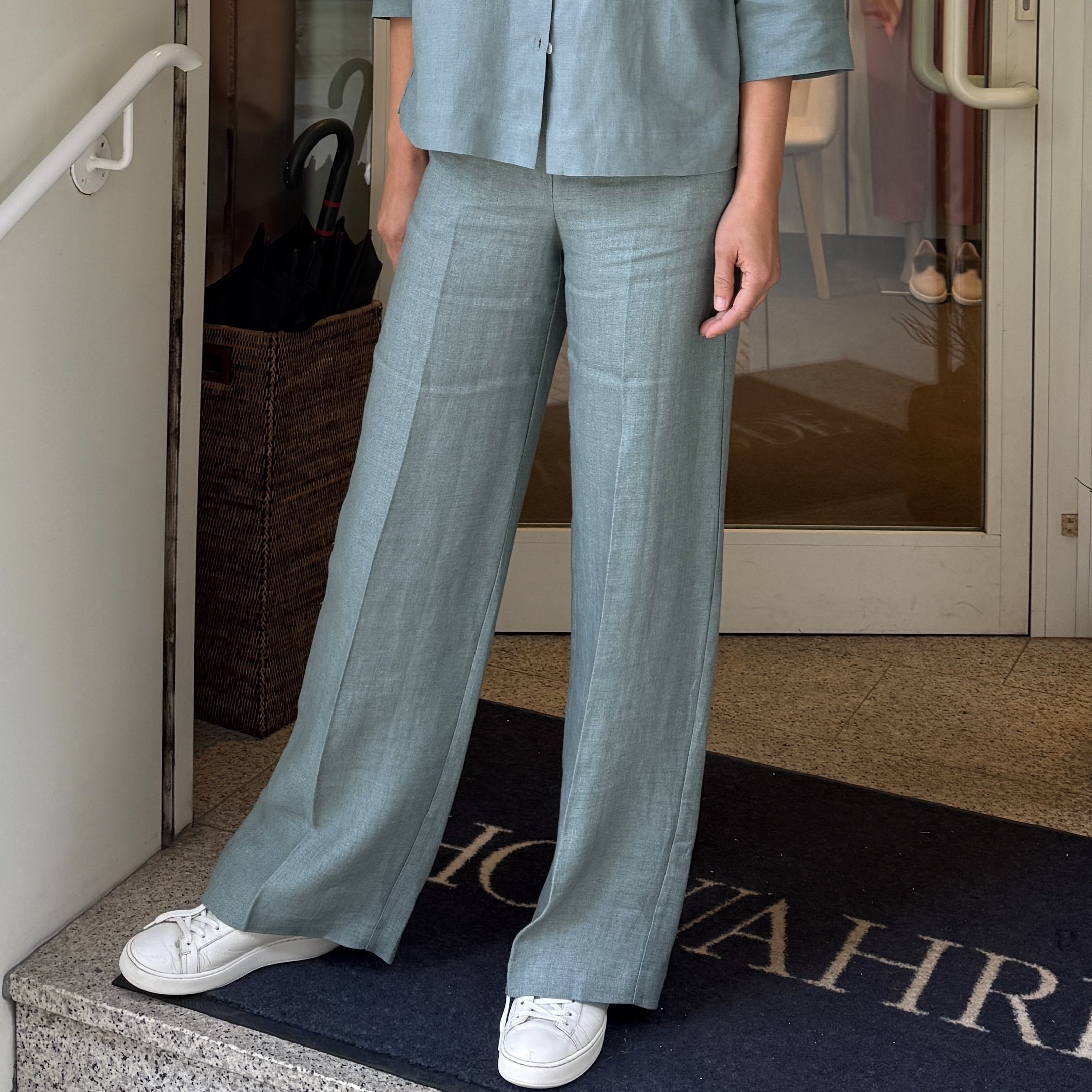 Sie hat eine hohe Leibhöhe, einen elastischen Bund und ein ausgestelltes Bein. Die perfekte Hose für den Urlaub in der Sonne.