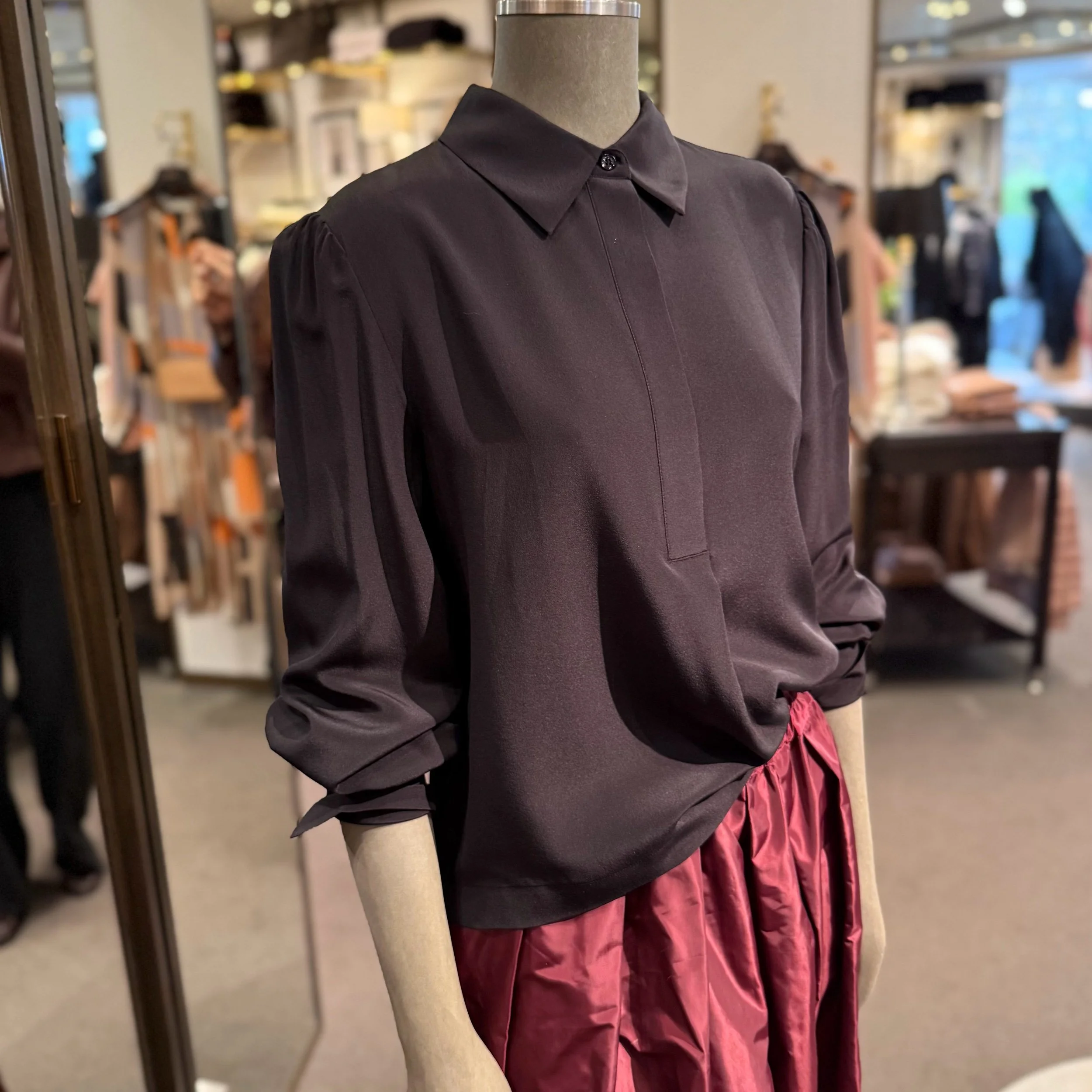 Diese edle Bluse besticht durch ihre fließende Silhouette und ihren dezenten Glanz. Gefertigt aus einer weich fallenden, leichten Seide, verleiht sie jedem Look eine elegante Note. Der klassische Hemdkragen und die verdeckte Knopfleiste sorgen für eine cleane, zeitlose Optik. Die leicht gerafften Schultern und locker geschnittenen Ärmel mit schmalen Manschetten unterstreichen den femininen Charakter der Bluse.