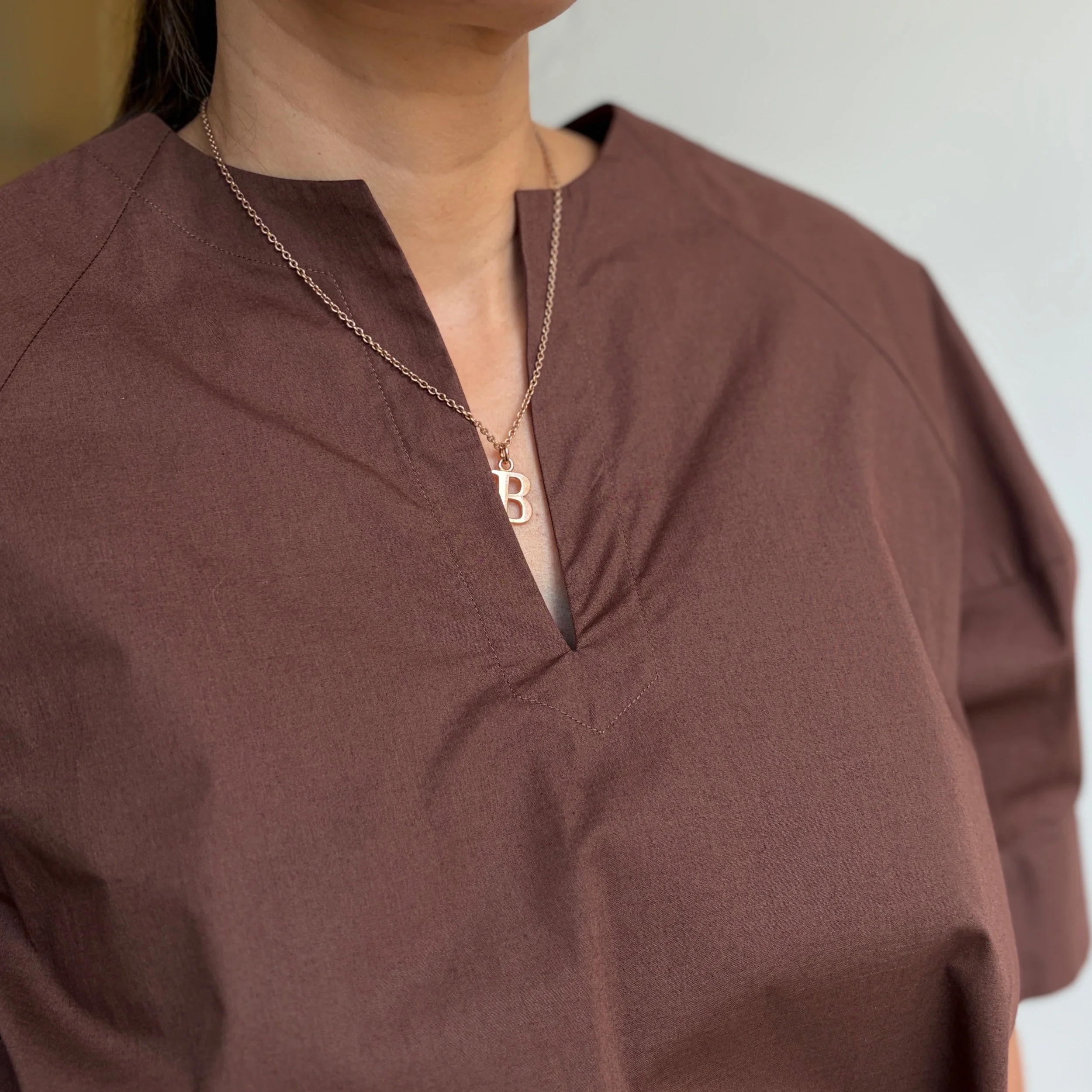 Diese Bluse hat leicht gepuffte Halbärmel und einen dezenten V-Ausschnitt mit schmalem Stehkragen.