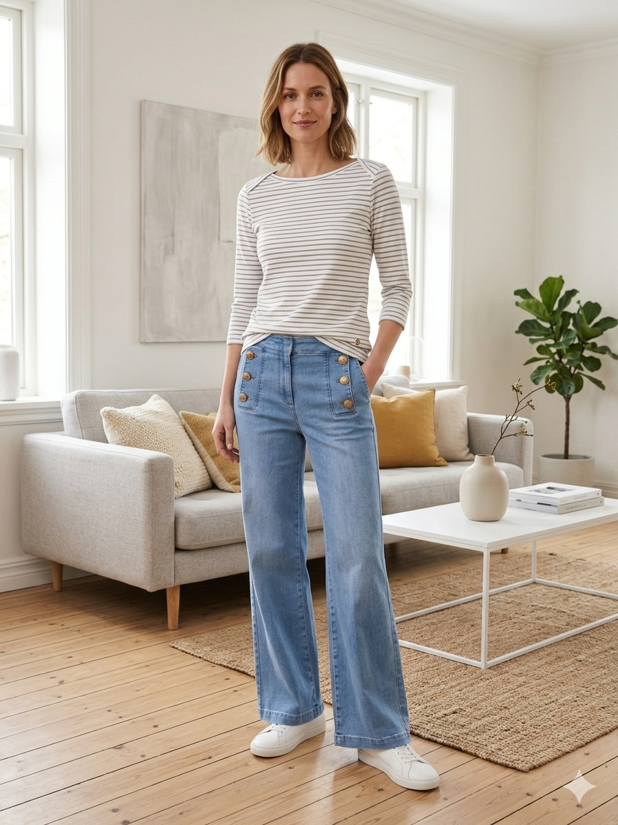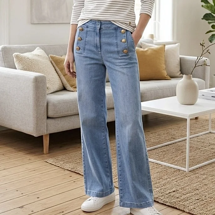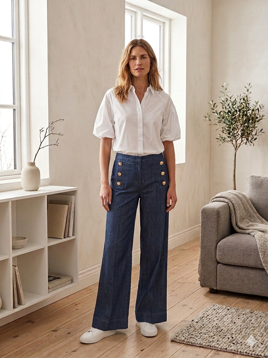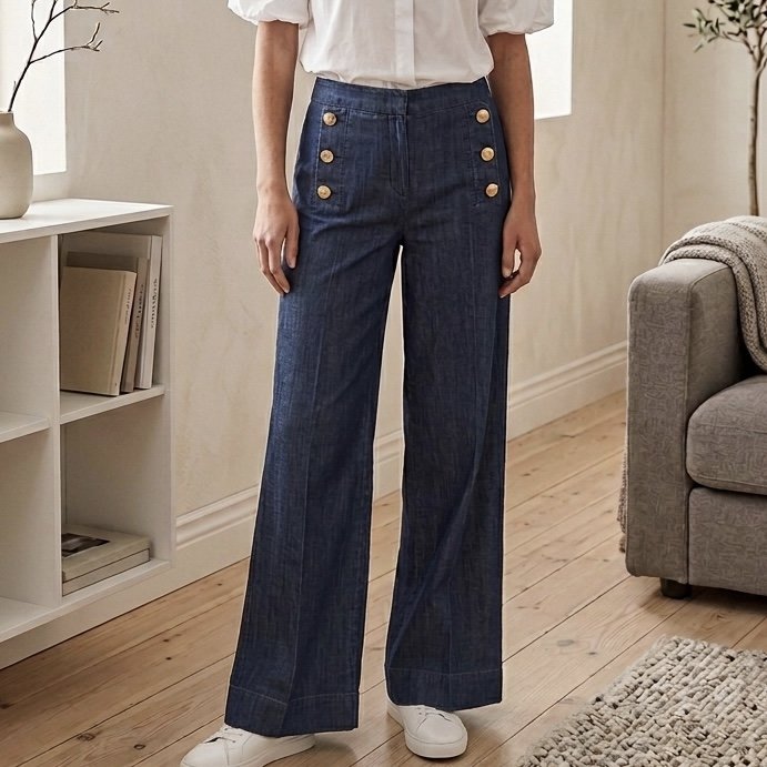 Die Hose hat ein weites Bein, 2 Paspeltaschen und ist durch die goldenen Sailor Knöpfe sehr stylisch.