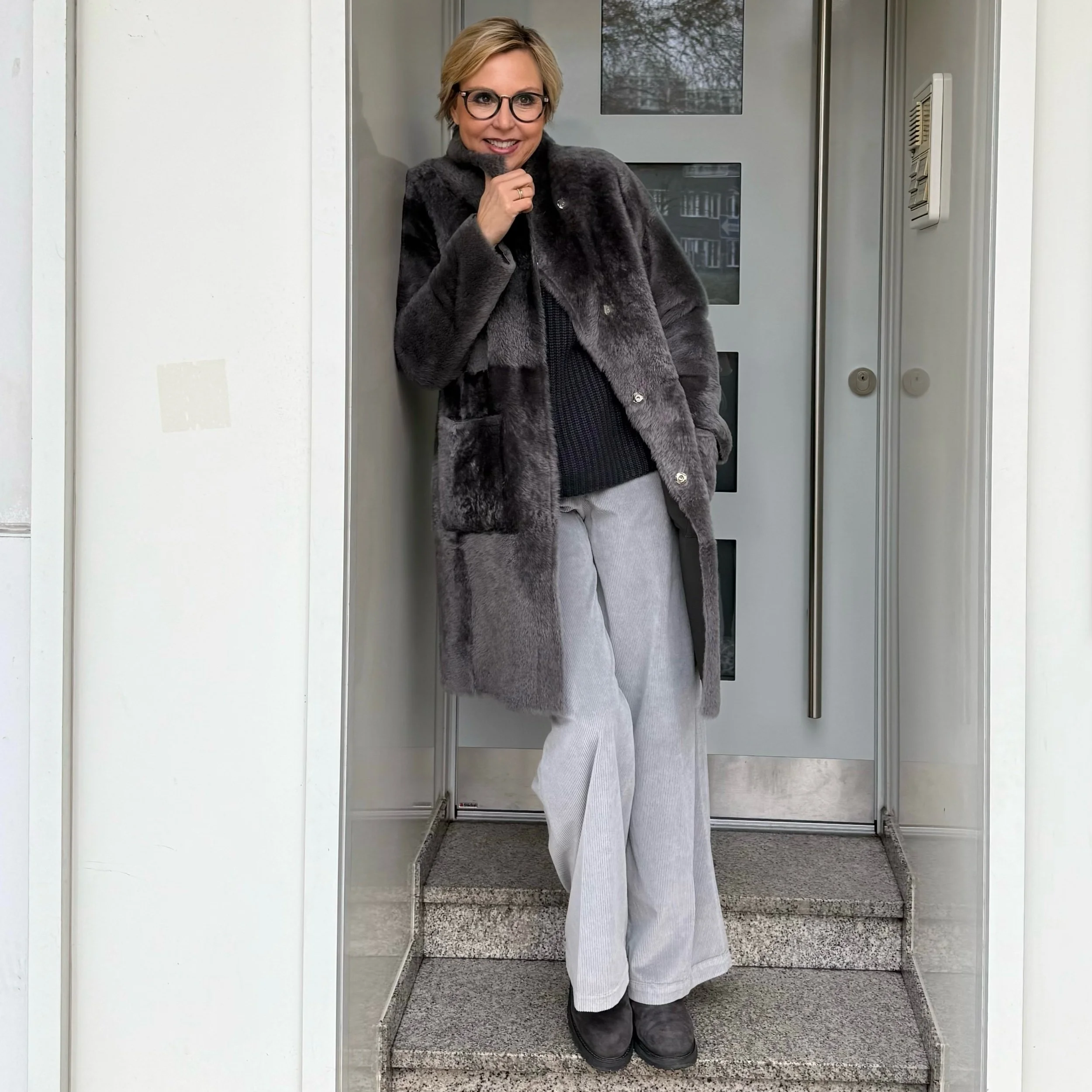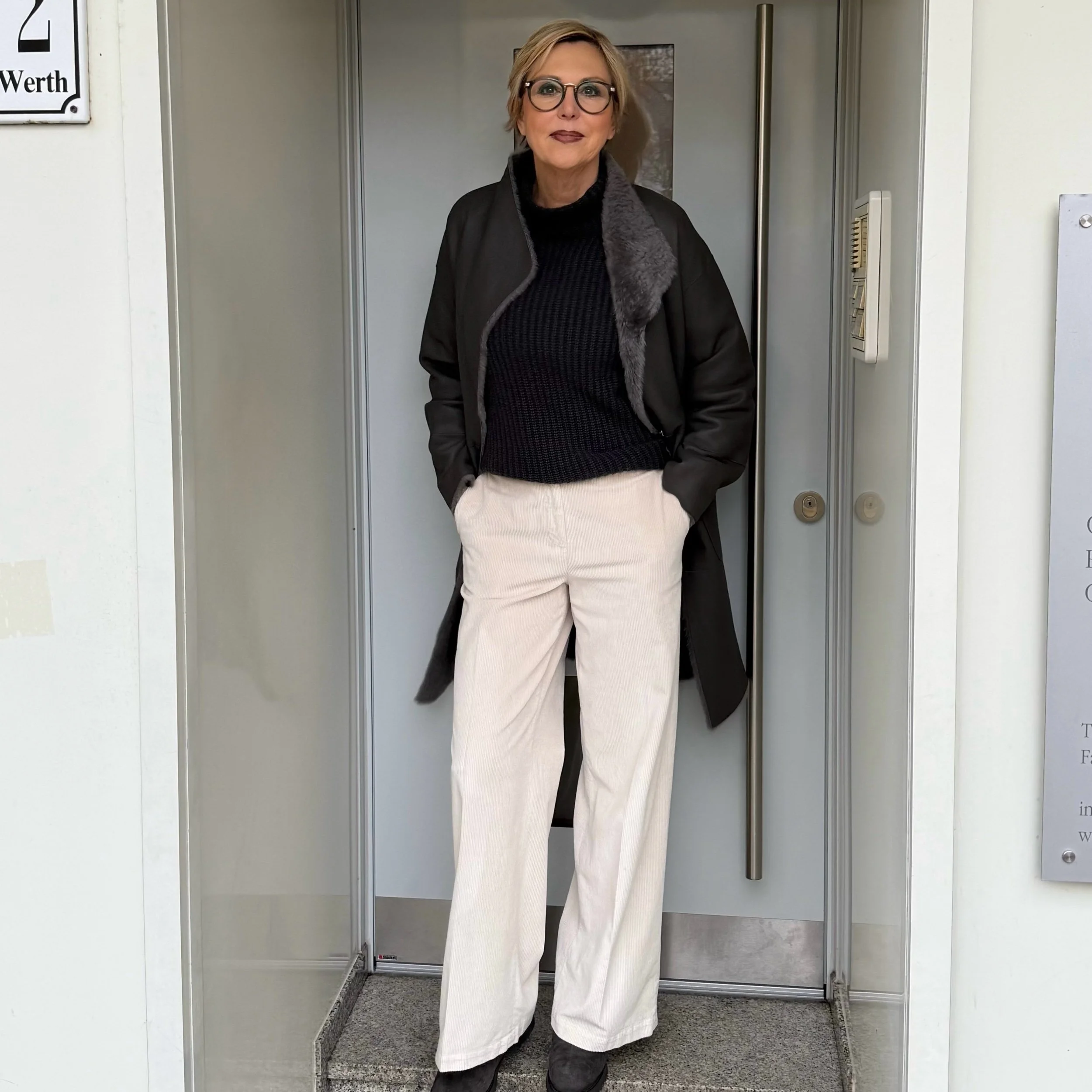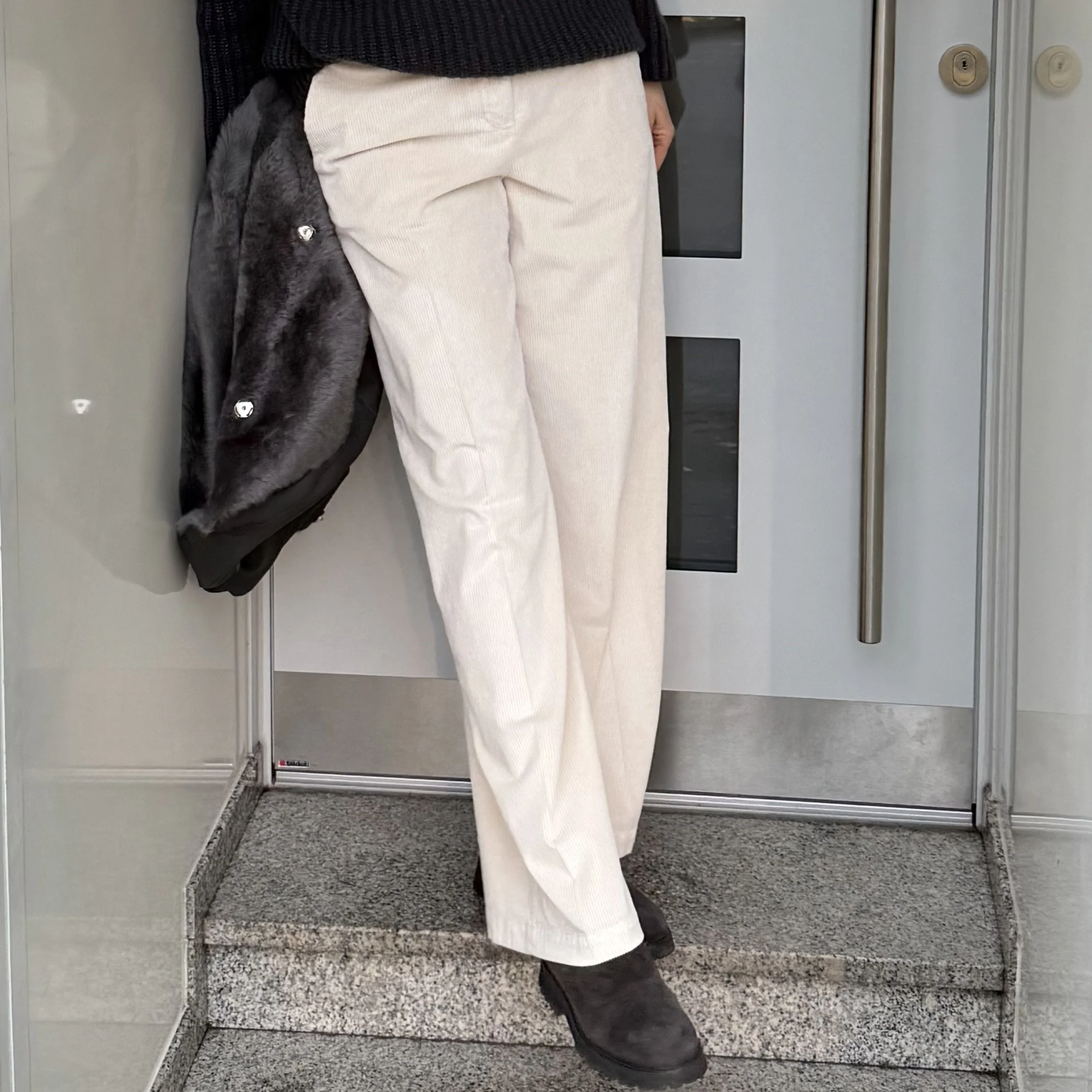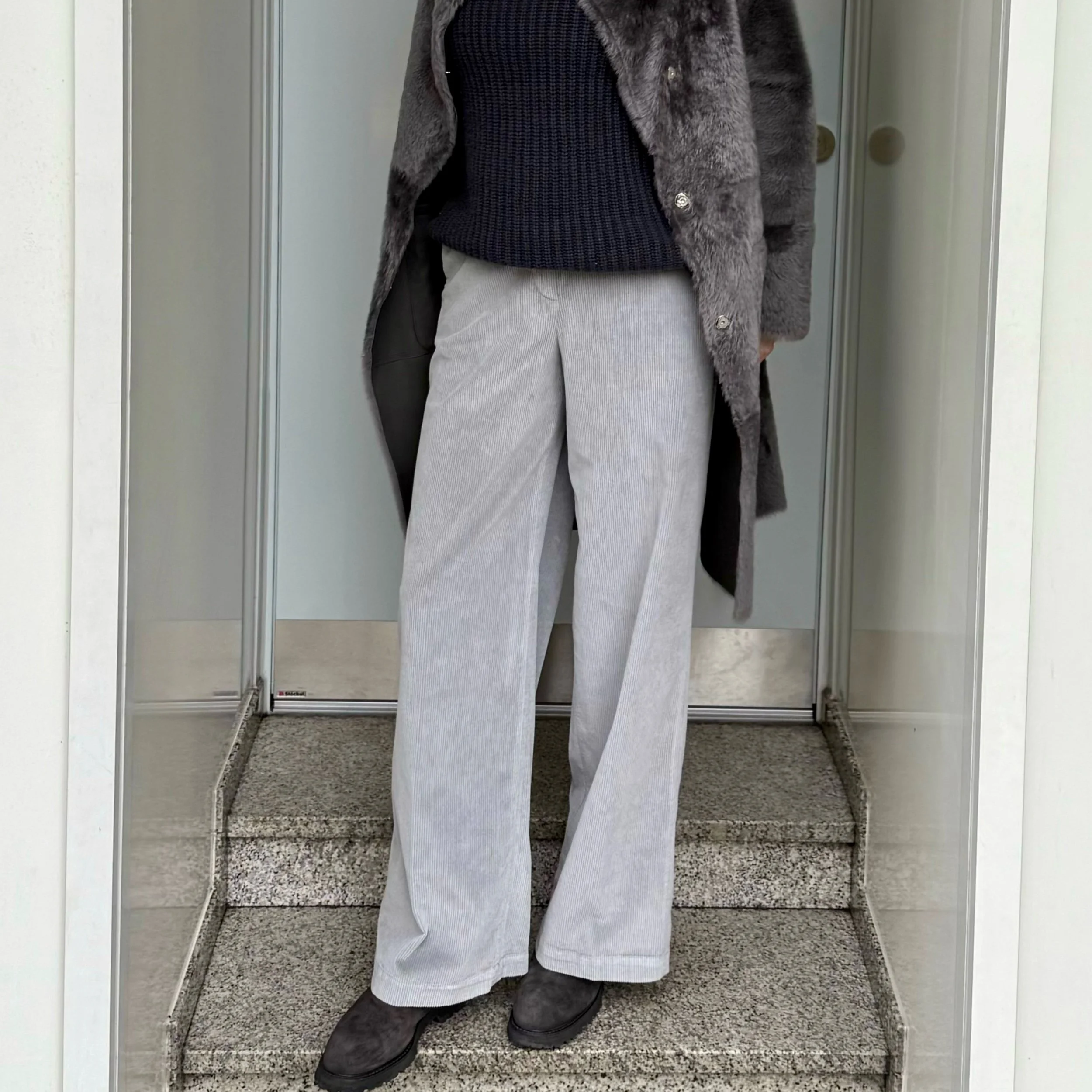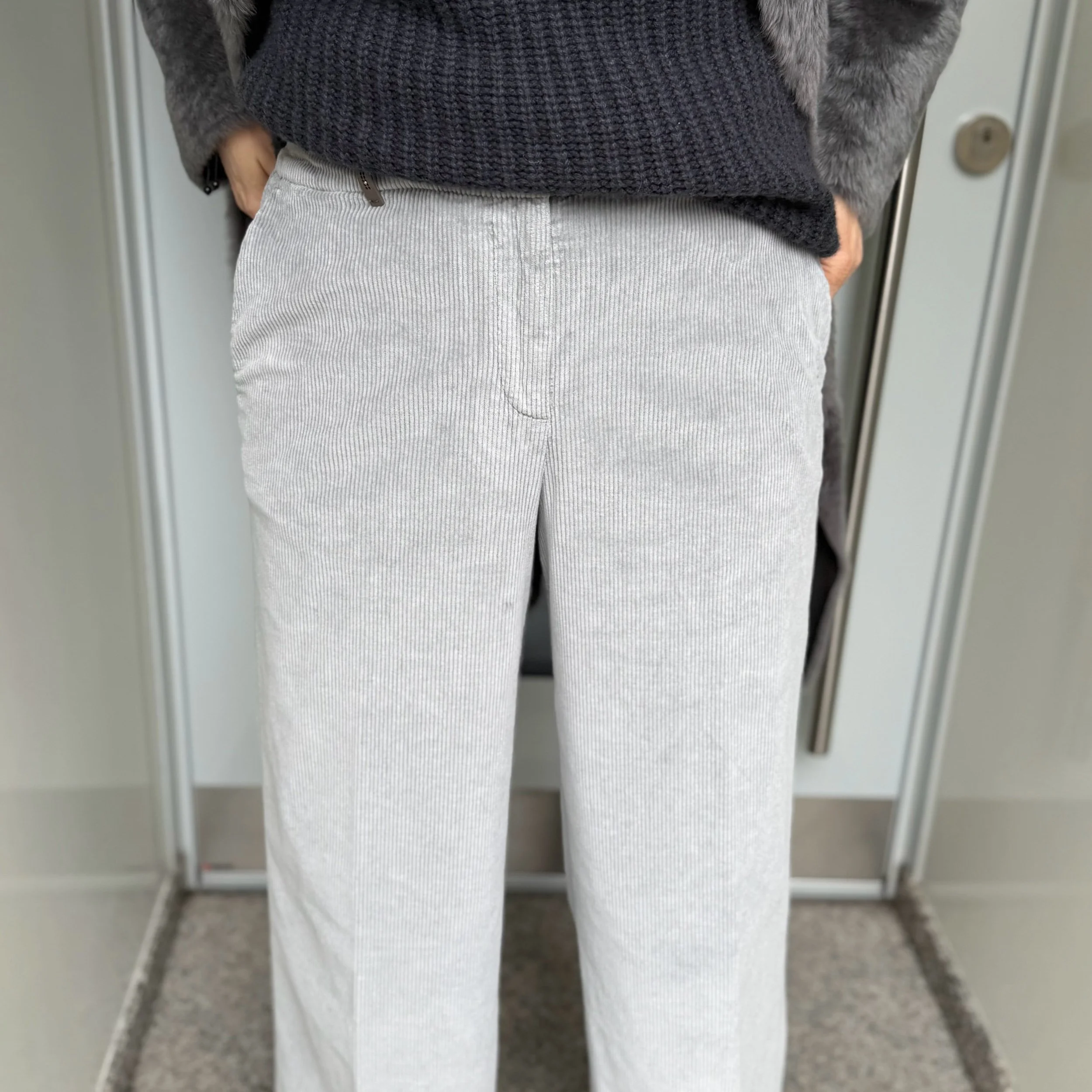 Sehr schöne, luxuriöse Cordhose, 5 Pocket, mit Gürtelschlaufen und seitlichen Eingrifftaschen. Sie hat ein langes, weites Bein.