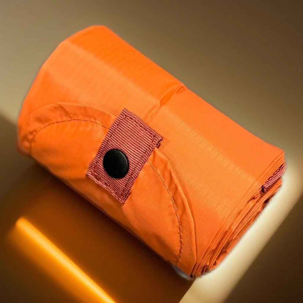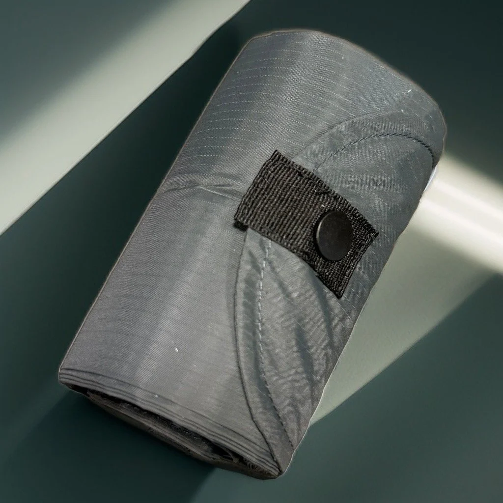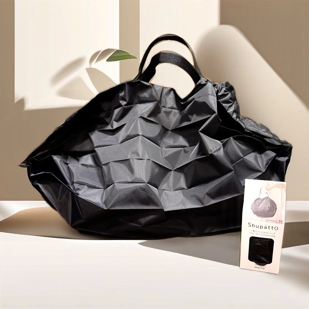 Wenn man sie braucht, entfaltet sie sich zu einer großen Tasche, die bis zu 15 l, (5 kg) maximal fassen kann.