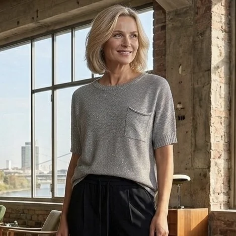 • Besonderes Highlight: In das feine Maschenbild eingearbeitete, dezente Pailletten sorgen für einen subtilen Schimmer-Effekt bei jeder Bewegung.