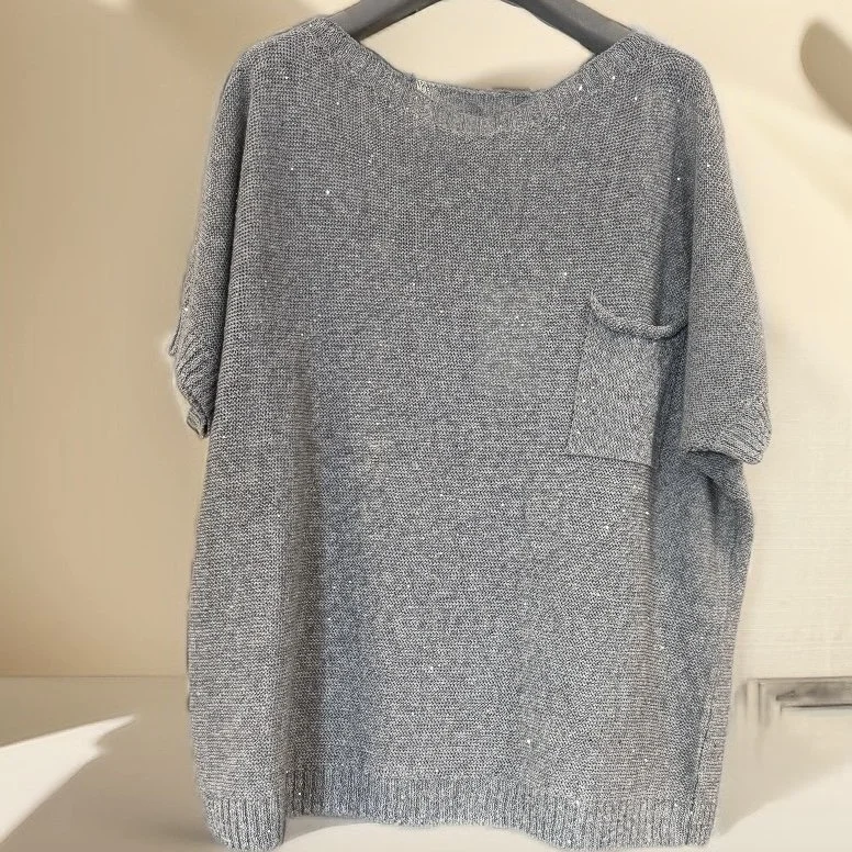 Dieser hochwertig verarbeitete Strickpullunder in meliertem Hellgrau mit vielen zurückhaltenden, glitzernden Pailletten ist der ideale Begleiter für die Übergangszeit oder kühle Sommerabende. Dank des edlen Leinenmix-Materials bietet er ein besonders luftiges und angenehmes Tragegefühl auf der Haut.