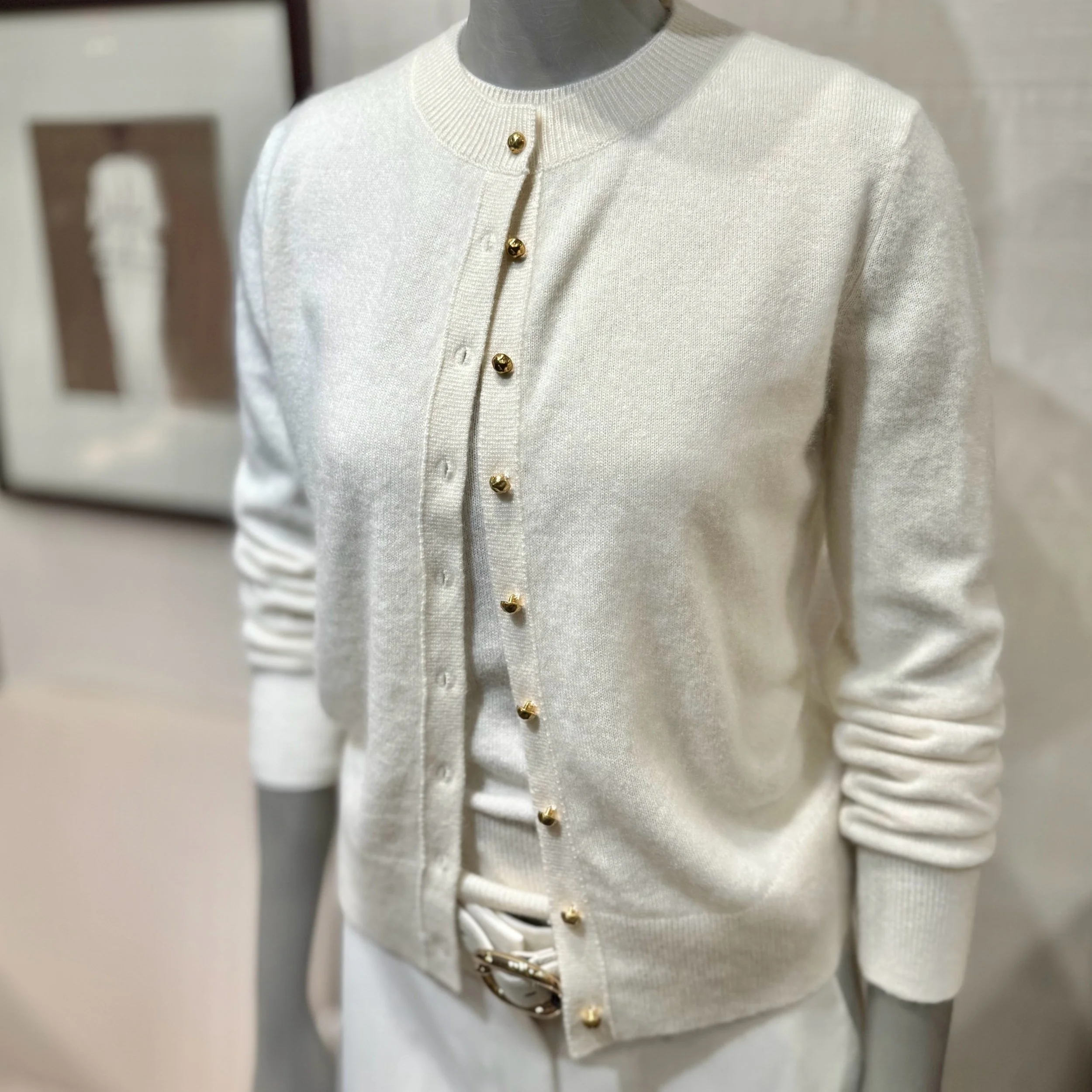 Twinset (Top und Cardigan) aus einer Cashmere-Baumwolle Mischung mit kleinen Goldknöpfen.