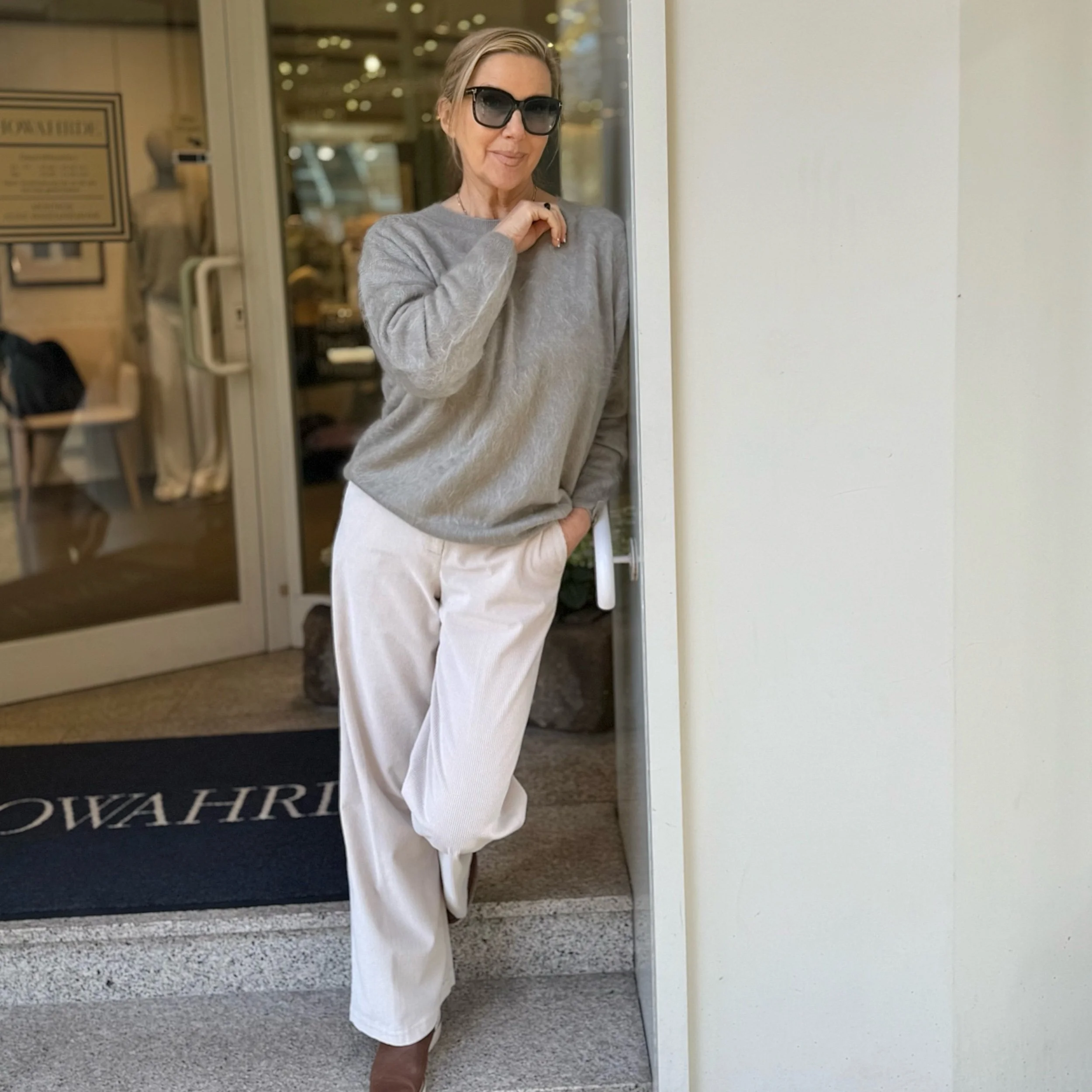 Als zusätzliches Accessoire hat sie eine kleine Taschenklappe am Bund.