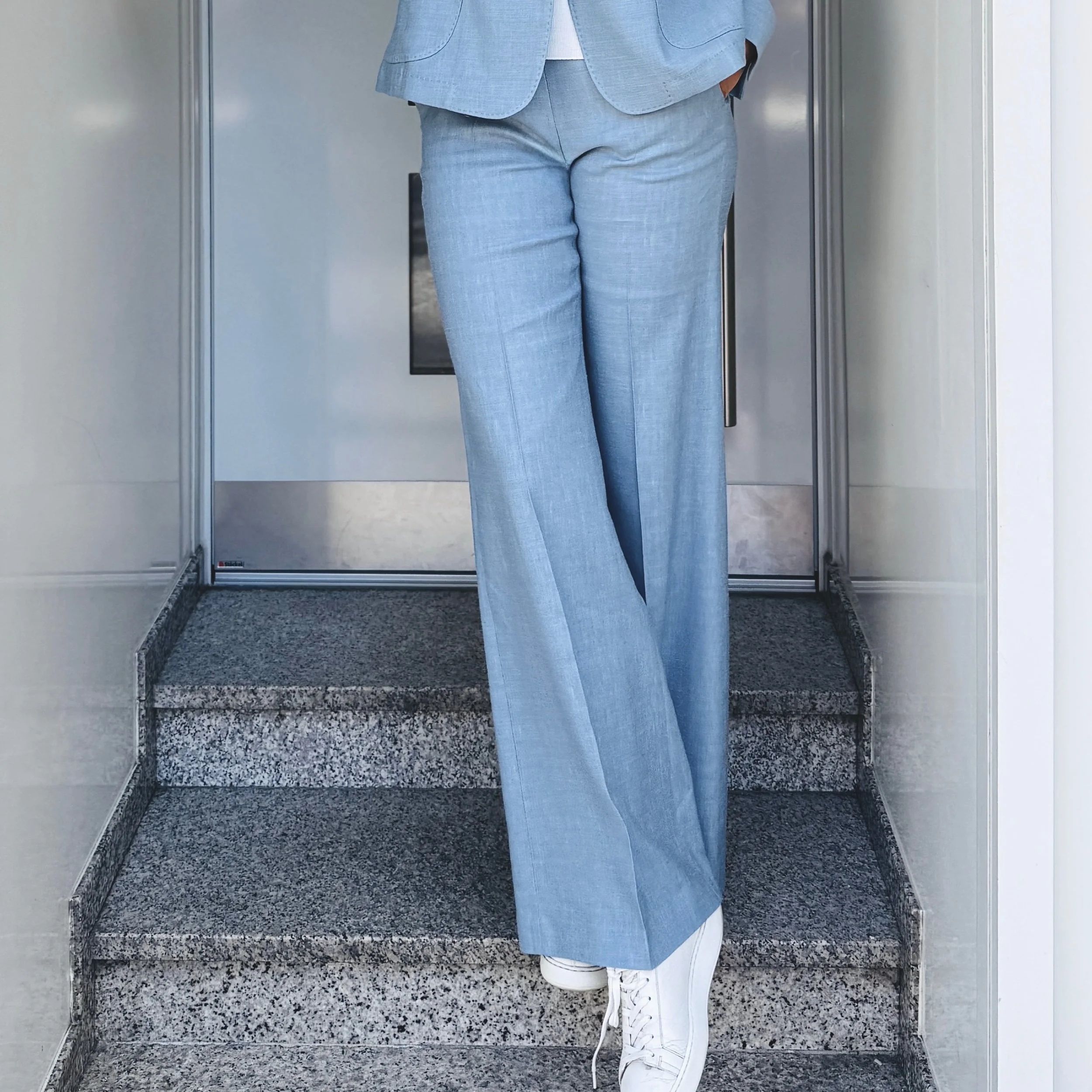 Verleihen Sie Ihrem Alltags-Look eine Brise sommerlicher Leichtigkeit mit unserer weit geschnittenen Hose im entspannten "Palazzo"-Stil. Gefertigt aus einem hochwertigen Leinen-Mischgewebe, vereint dieses Modell Komfort mit souveräner Eleganz. Die dezente Struktur des Materials und die wunderschöne hellblaue Farbe machen diese Hose zum idealen Begleiter für Büro, Brunch oder entspannte Abende im Freien.