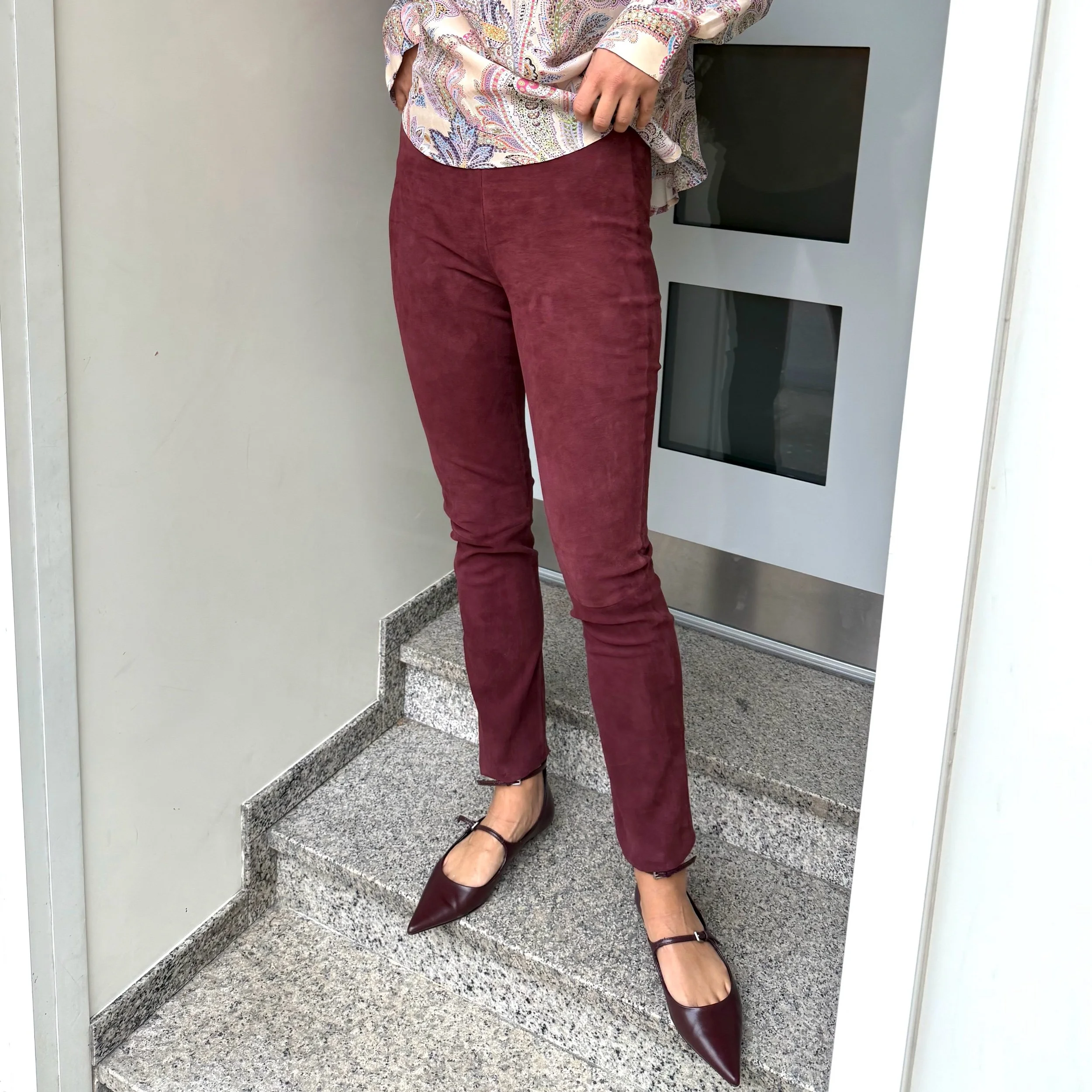 Gut sitzende, elastische, schmale Veloursleder Hose.