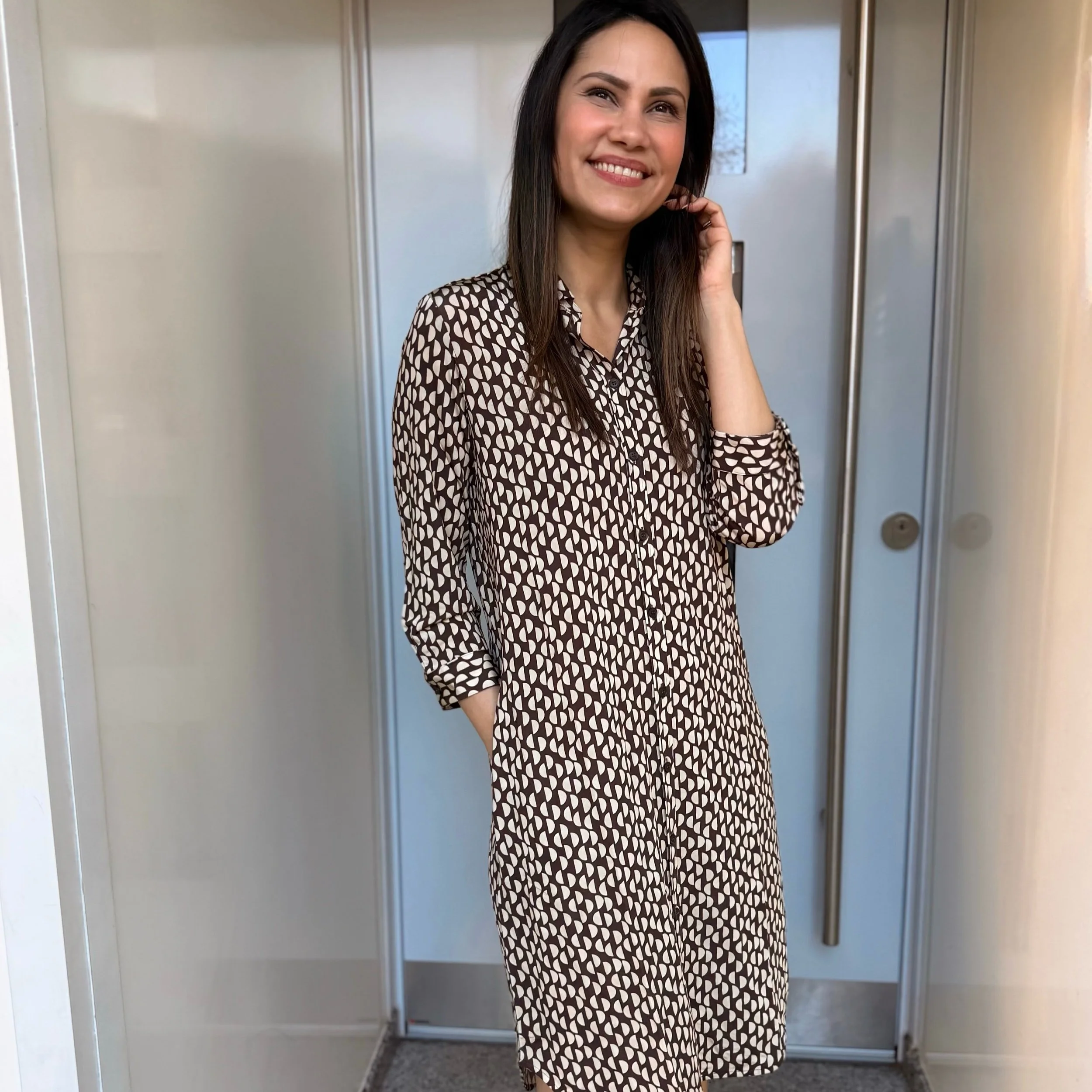 Durchgeknöpftes, lässiges MIDI-Kleid mit Kragen, im Allover-Print, mit seitlichen Eingrifftaschen und einem 3/4 Arm.