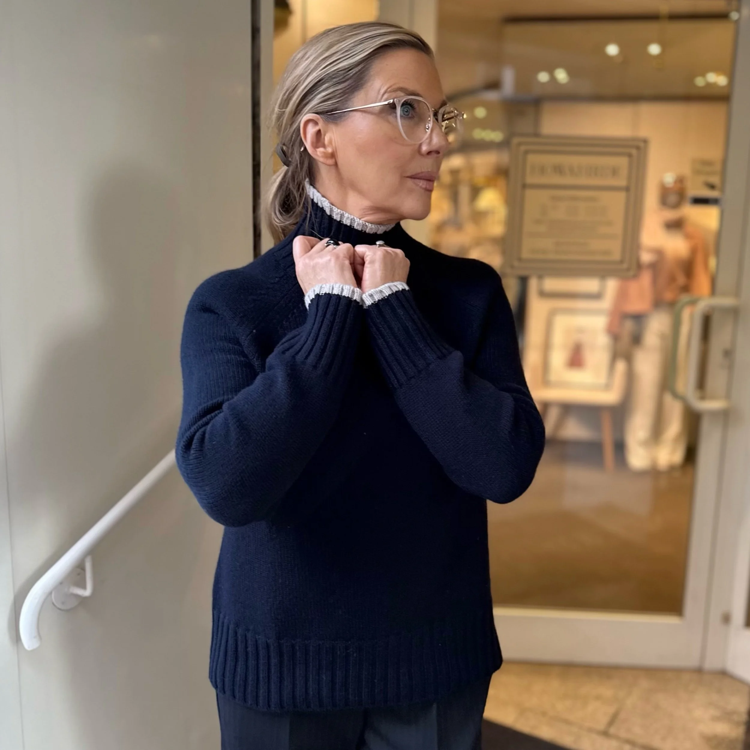 Pullover mit hellen Kontraststreifen am Turtleneck und an den Ärmel-enden.