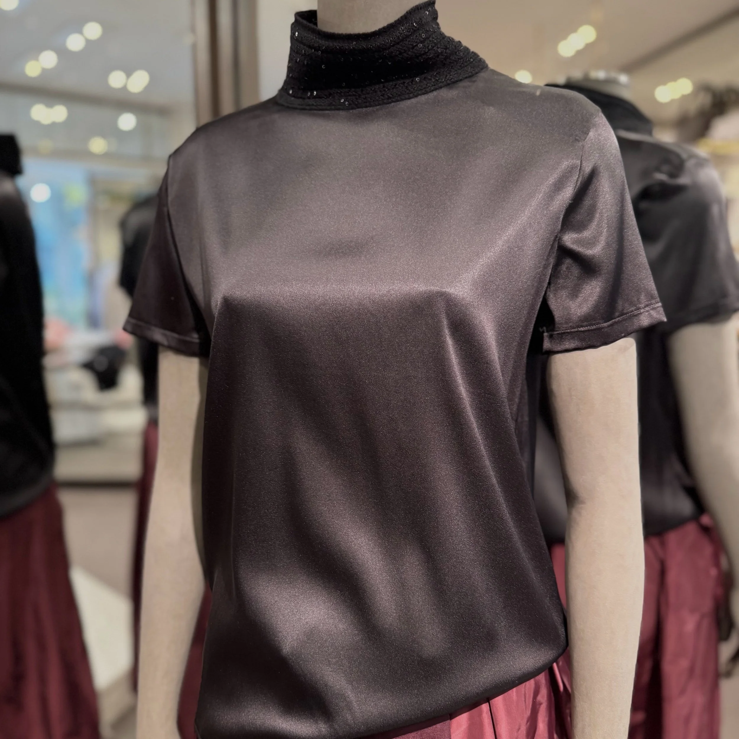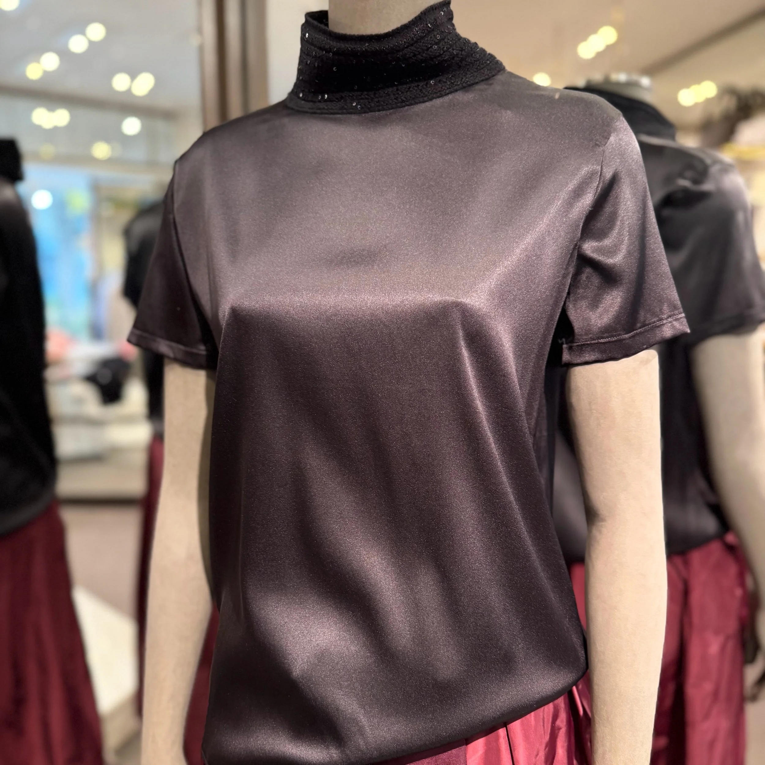 Diese elegante Kurzarm Bluse mit einem Stehkragen aus Pailletten vereint zeitlose Klasse mit einem Hauch von Luxus. Es gibt die Bluse auch in silber.