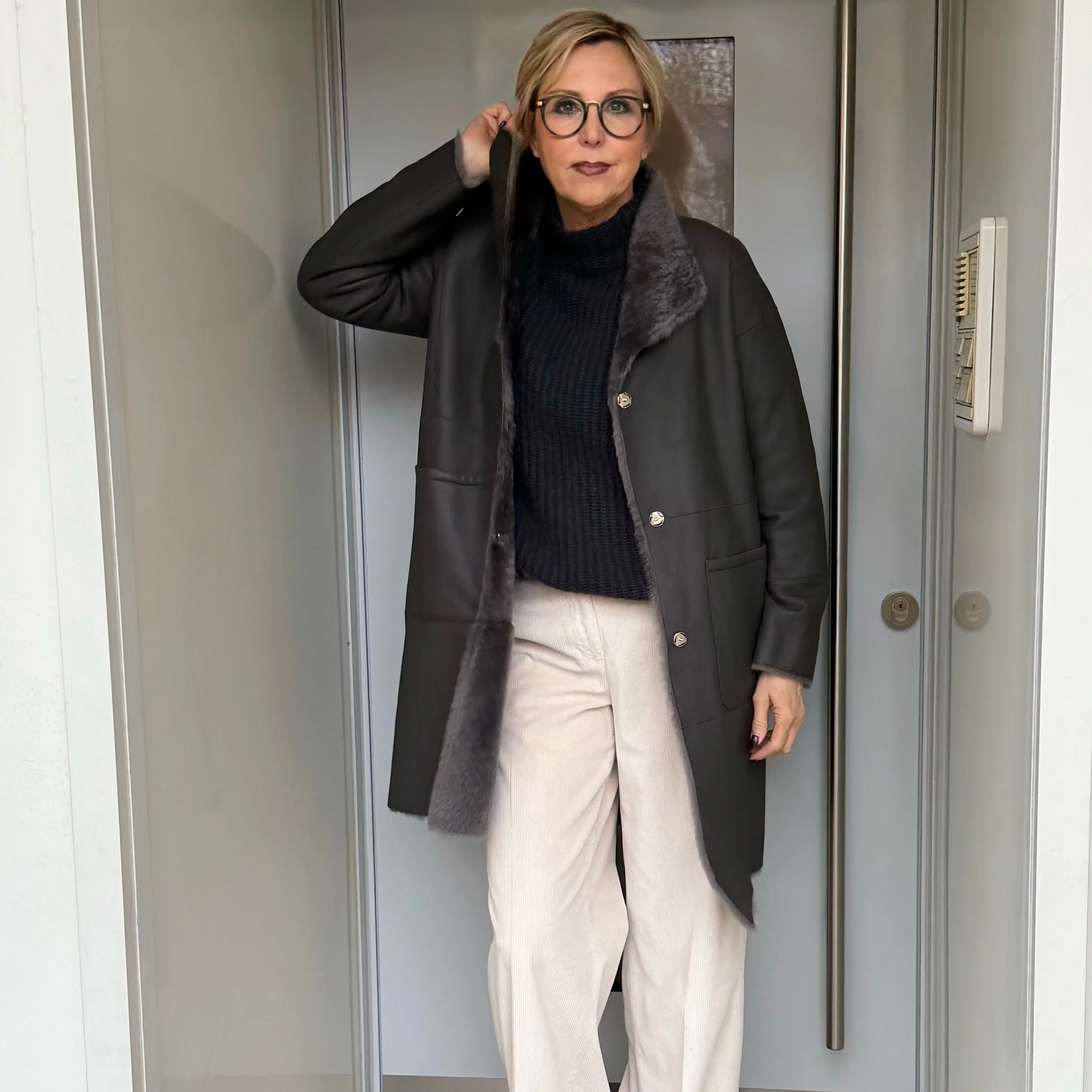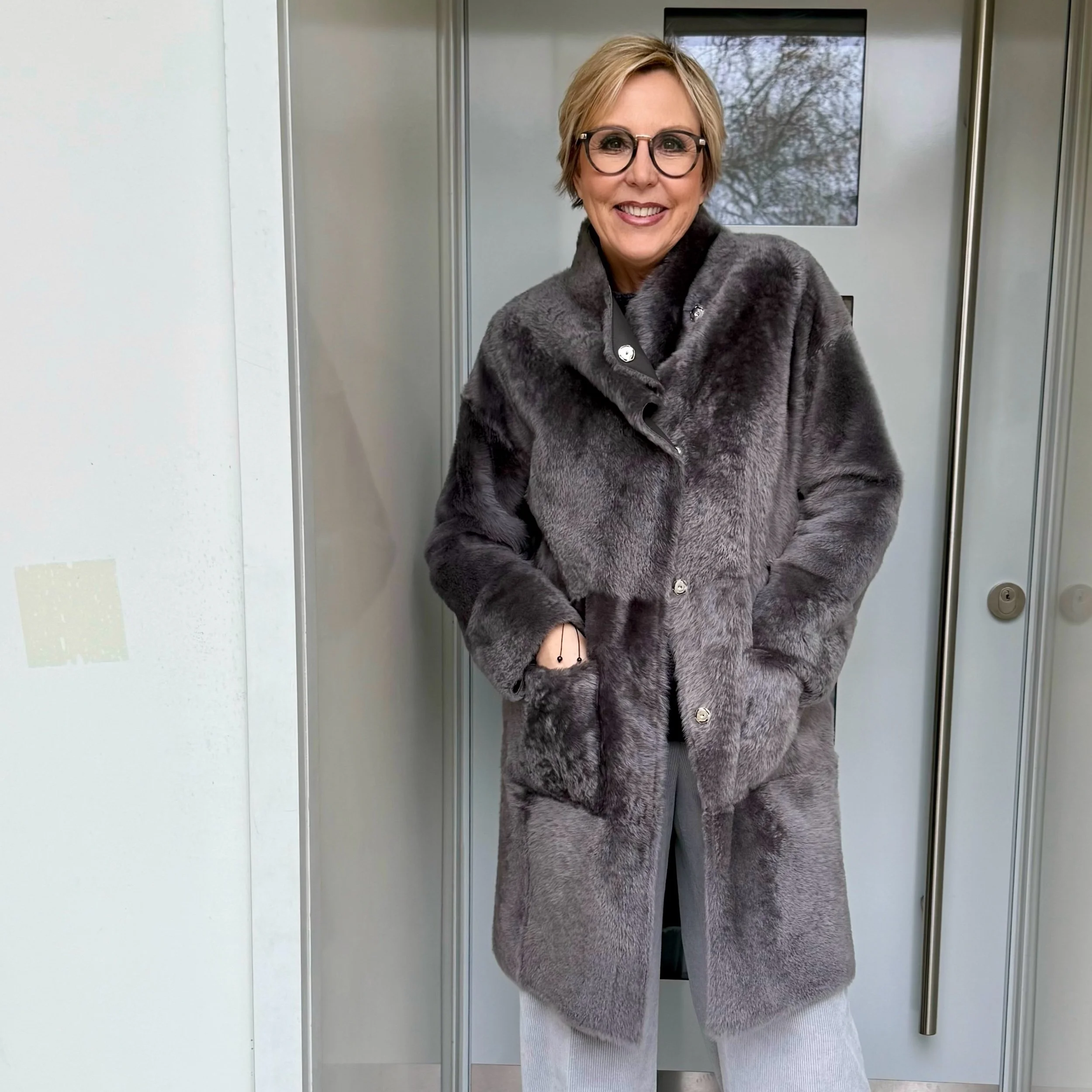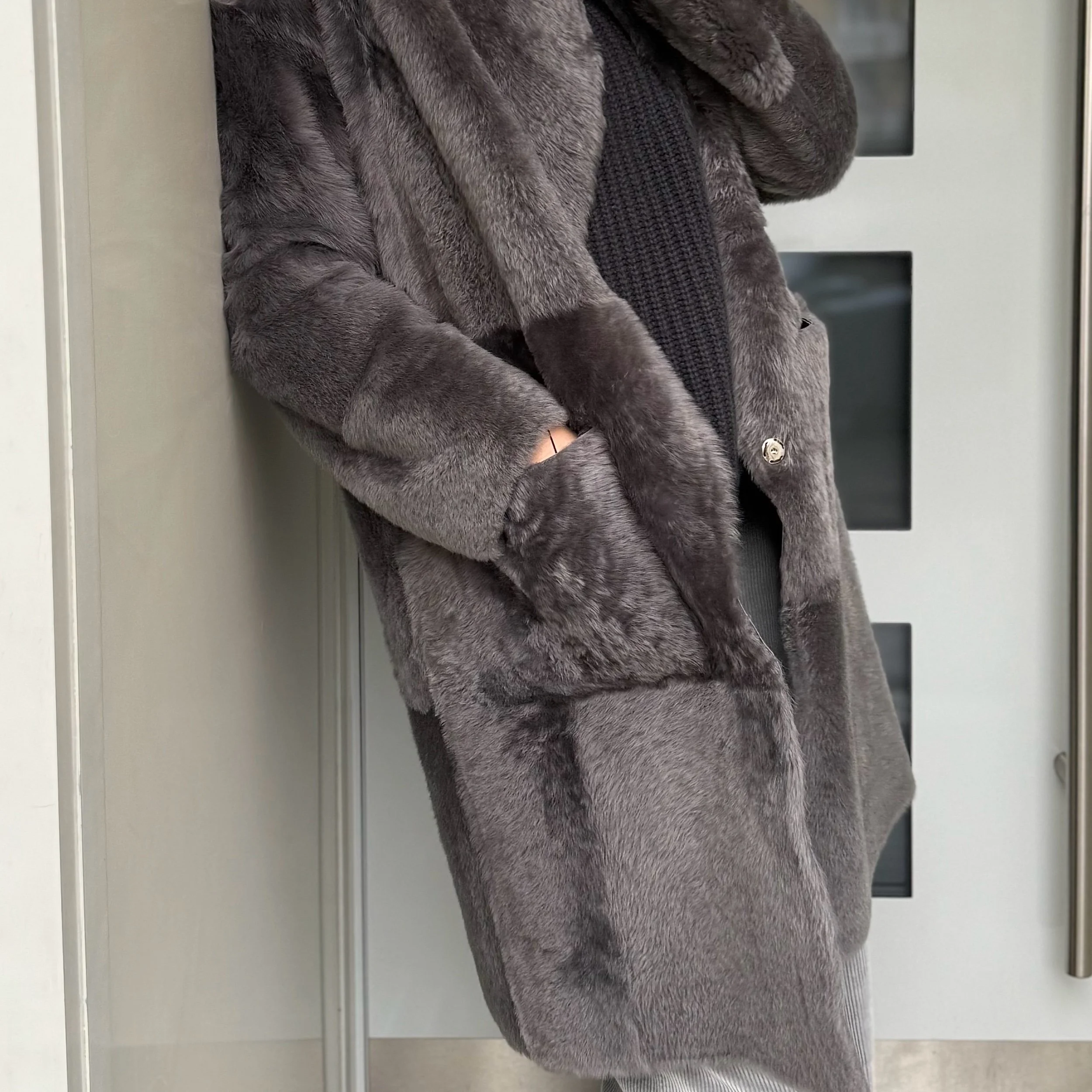 Luxuriöser Lammfell-Wende-Mantel, der durch Passform und Leichtigkeit besticht.