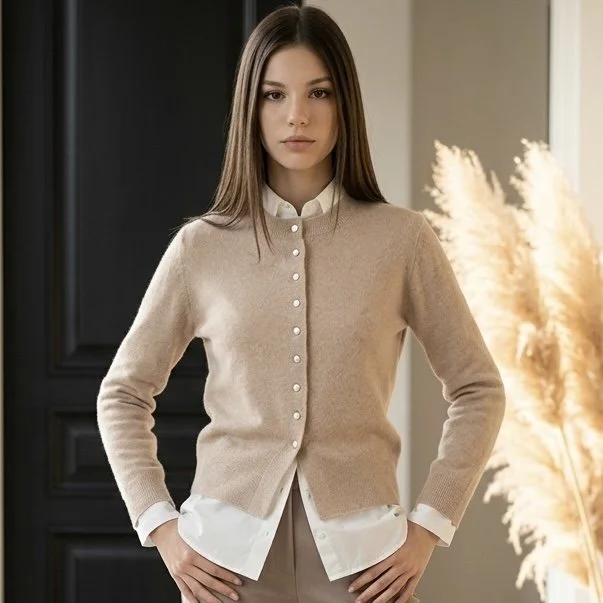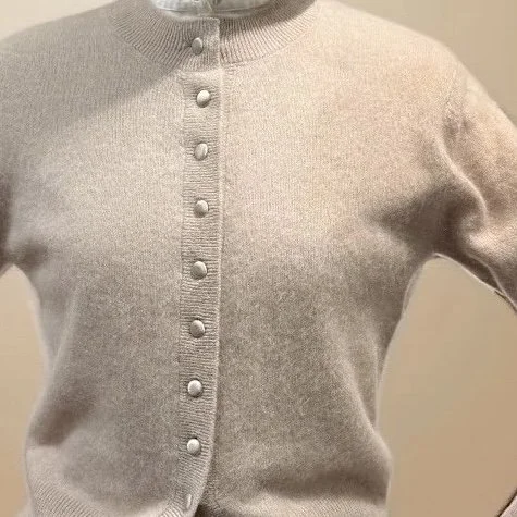 Wunderschöne Strickjacke aus gebrushtem Cashmere mit bezogenen Knöpfen.