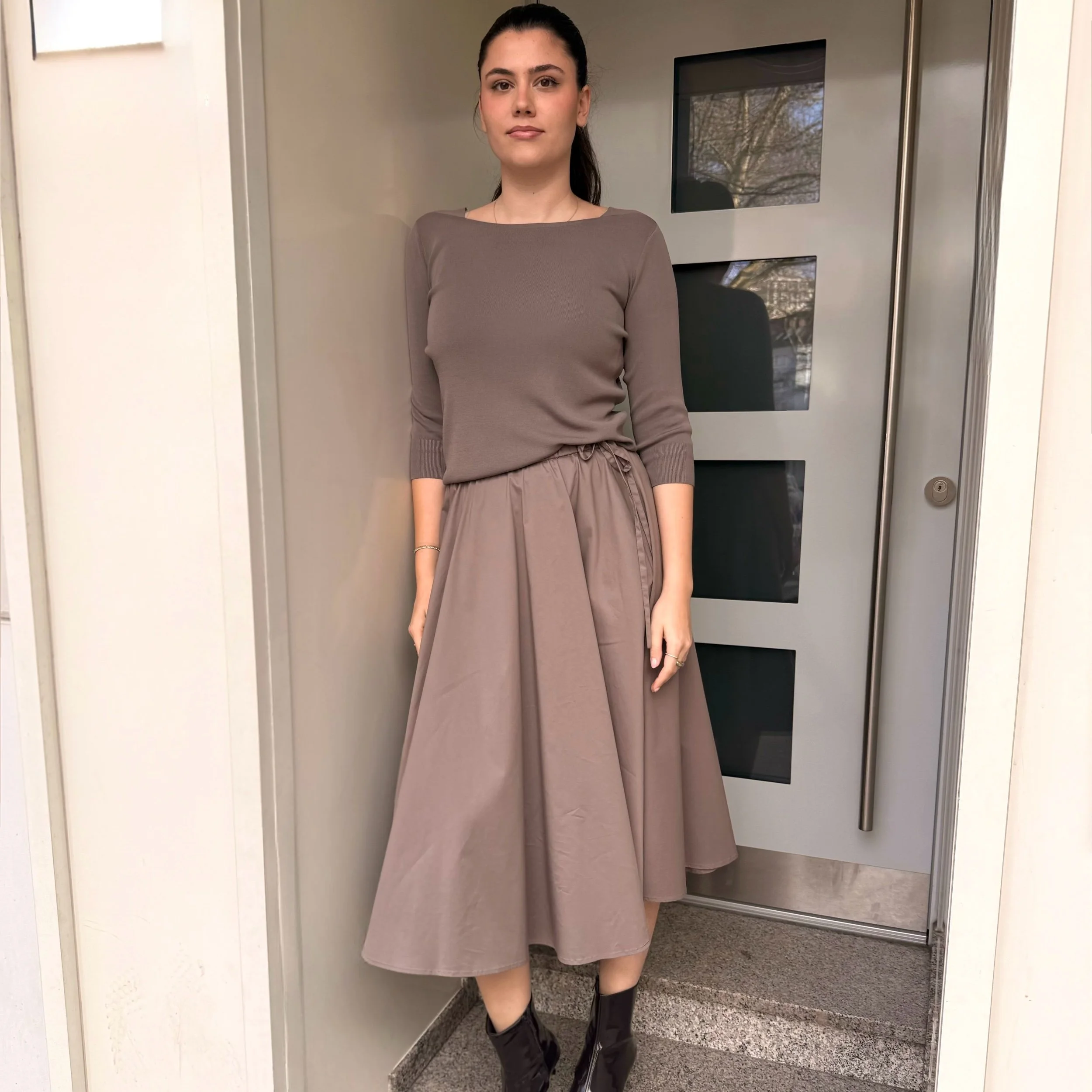 Der elastische Bund sorgt für eine bequeme Passform und ein angenehmes Tragegefühl, während die locker fallende Silhouette sanft umspielt und Bewegungsfreiheit bietet. Die Midi-Länge macht den Rock vielseitig kombinierbar – von casual mit Sneakern bis elegant mit Bluse und Absatzschuhen.
