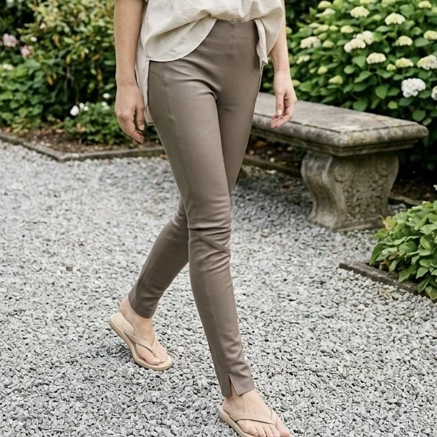 Diese Leggings definieren Luxus neu. Gefertigt aus handschuhweichem Leder, schmiegt sie sich wie eine zweite Haut an und verleiht jedem Outfit sofort eine edle, moderne Attraktivität. Der warme Taupe-Ton ist die perfekte, weichere Alternative zu Schwarz und lässt sich mühelos mit hellen Naturtönen oder kräftigen Farben kombinieren.